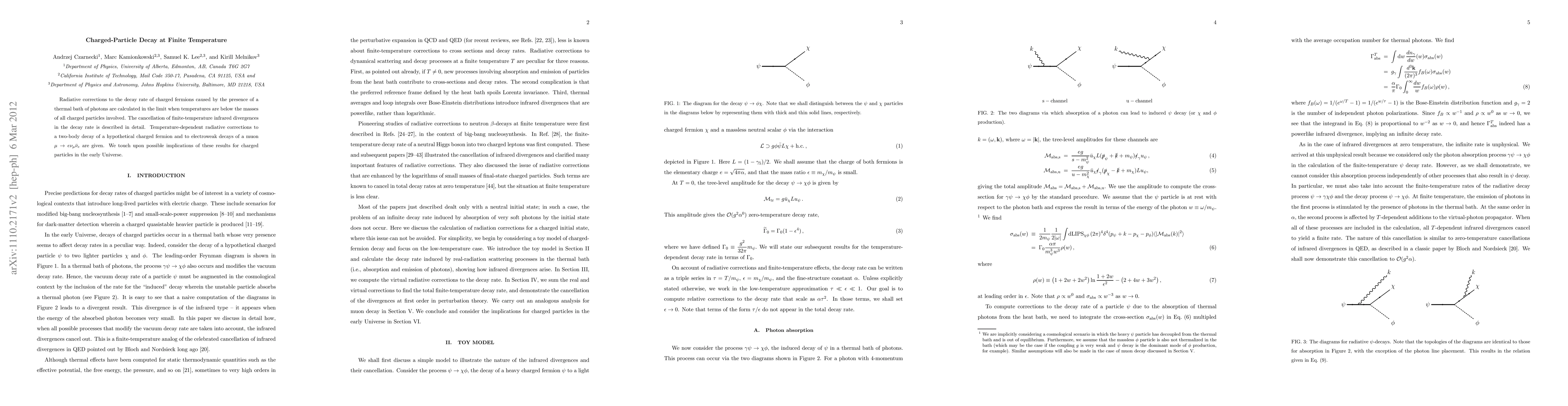 Radiative corrections to the decay rate of charged fermions caused by the presence of a thermal bath of photons are calculated in the limit when temperatures are below the masses of all charged particles involved. The cancellation of finite-temperature infrared divergences in the decay rate is described in detail. Temperature-dependent radiative corrections to a two-body decay of a hypothetical charged fermion and to electroweak decays of a muon are given. We touch upon possible implications of these results for charged particles in the early Universe.