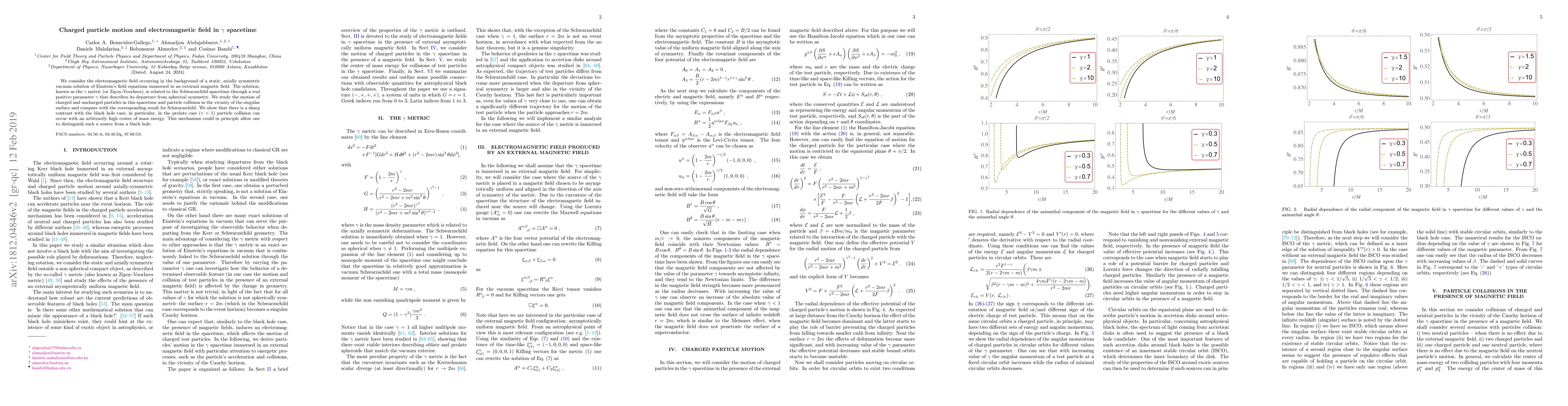 This paper explores charged particle motion and electromagnetic fields in the $\gamma$ metric, a non-spherically symmetric spacetime solution. It reveals that in the prolate case ($\gamma<1$), particle collisions can achieve arbitrarily high center of mass energies, potentially distinguishing such sources from black holes.
