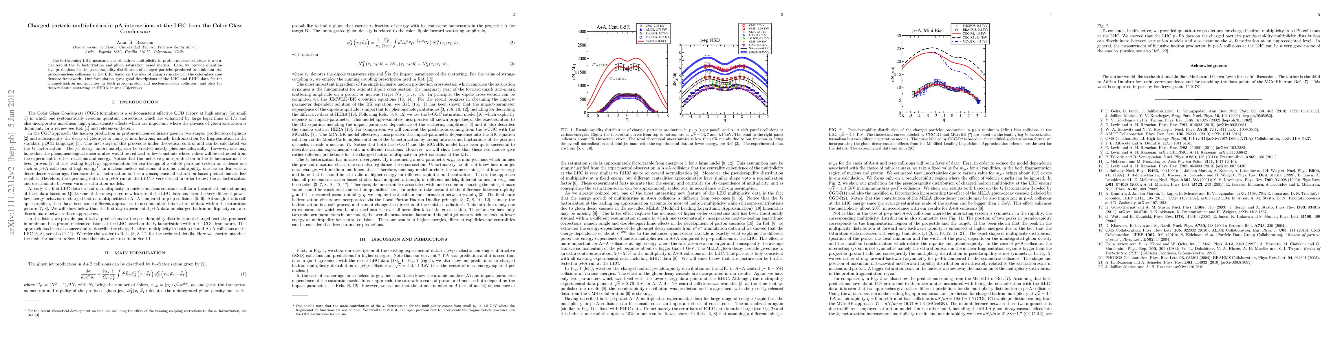 This paper presents predictions for charged particle multiplicities in proton-nucleus collisions at the LHC based on gluon saturation in the color-glass condensate framework, showing good agreement with LHC, RHIC, and HERA data. The study tests k_t factorization and gluon saturation models.