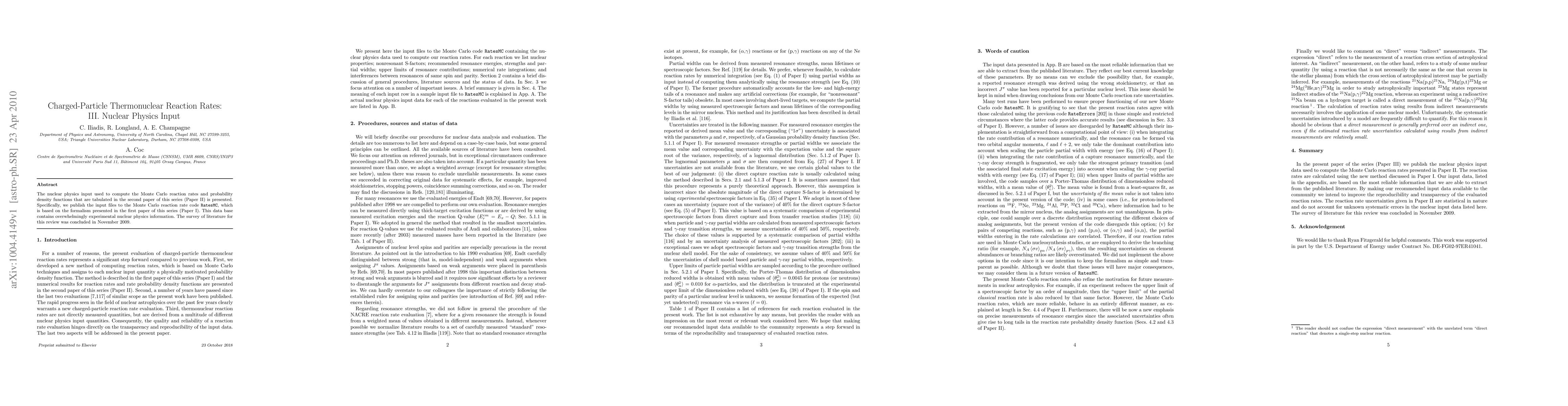 The nuclear physics input used to compute the Monte Carlo reaction rates and probability density functions that are tabulated in the second paper of this series (Paper II) is presented. Specifically, we publish the input files to the Monte Carlo reaction rate code RatesMC, which is based on the formalism presented in the first paper of this series (Paper I). This data base contains overwhelmingly experimental nuclear physics information. The survey of literature for this review was concluded in November 2009.