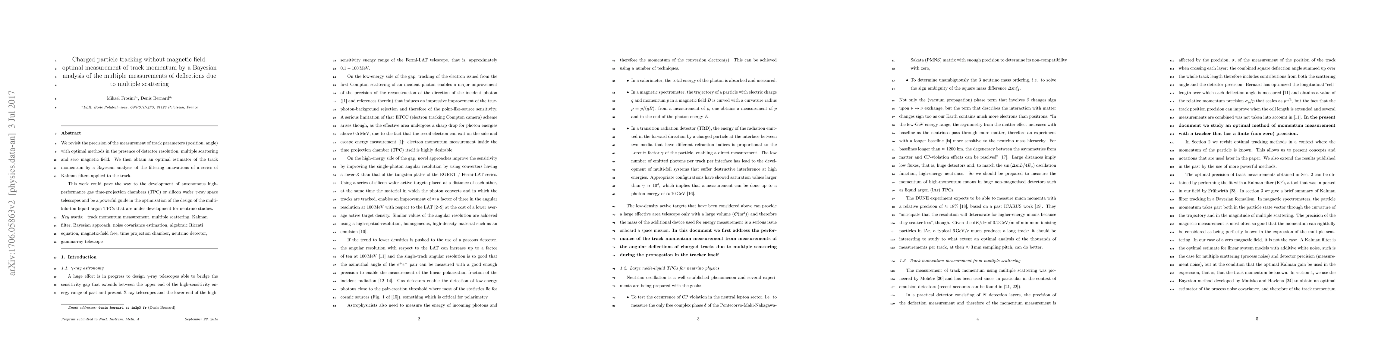 We revisit the precision of the measurement of track parameters (position, angle) with optimal methods in the presence of detector resolution, multiple scattering and zero magnetic field. We then obtain an optimal estimator of the track momentum by a Bayesian analysis of the filtering innovations of a series of Kalman filters applied to the track. This work could pave the way to the development of autonomous high-performance gas time-projection chambers (TPC) or silicon wafer gamma-ray space telescopes and be a powerful guide in the optimisation of the design of the multi-kilo-ton liquid argon TPCs that are under development for neutrino studies.