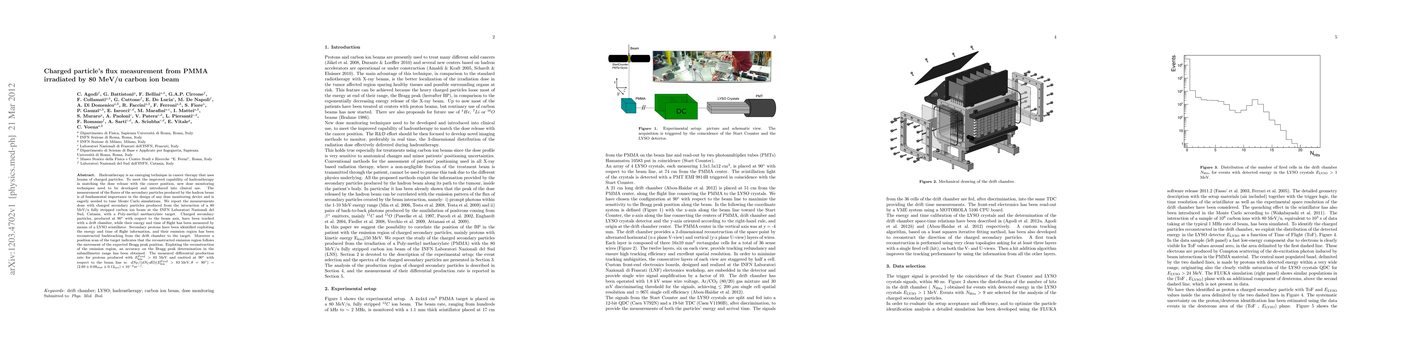 Hadrontherapy is an emerging technique in cancer therapy that uses beams of charged particles. To meet the improved capability of hadrontherapy in matching the dose release with the cancer position, new dose monitoring techniques need to be developed and introduced into clinical use. The measurement of the fluxes of the secondary particles produced by the hadron beam is of fundamental importance in the design of any dose monitoring device and is eagerly needed to tune Monte Carlo simulations. We report the measurements done with charged secondary particles produced from the interaction of a 80 MeV/u fully stripped carbon ion beam at the INFN Laboratori Nazionali del Sud, Catania, with a Poly-methyl methacrylate target. Charged secondary particles, produced at 90$\degree$ with respect to the beam axis, have been tracked with a drift chamber, while their energy and time of flight has been measured by means of a LYSO scintillator. Secondary protons have been identified exploiting the energy and time of flight information, and their emission region has been reconstructed backtracking from the drift chamber to the target. Moreover a position scan of the target indicates that the reconstructed emission region follows the movement of the expected Bragg peak position. Exploting the reconstruction of the emission region, an accuracy on the Bragg peak determination in the submillimeter range has been obtained. The measured differential production rate for protons produced with $E^{\rm Prod}_{\rm kin} >$ 83 MeV and emitted at 90$\degree$ with respect to the beam line is: $dN_{\rm P}/(dN_{\rm C}d\Omega)(E^{\rm Prod}_{\rm kin} > 83 {\rm ~MeV}, \theta=90\degree)= (2.69\pm 0.08_{\rm stat} \pm 0.12_{\rm sys})\times 10^{-4} sr^{-1}$.