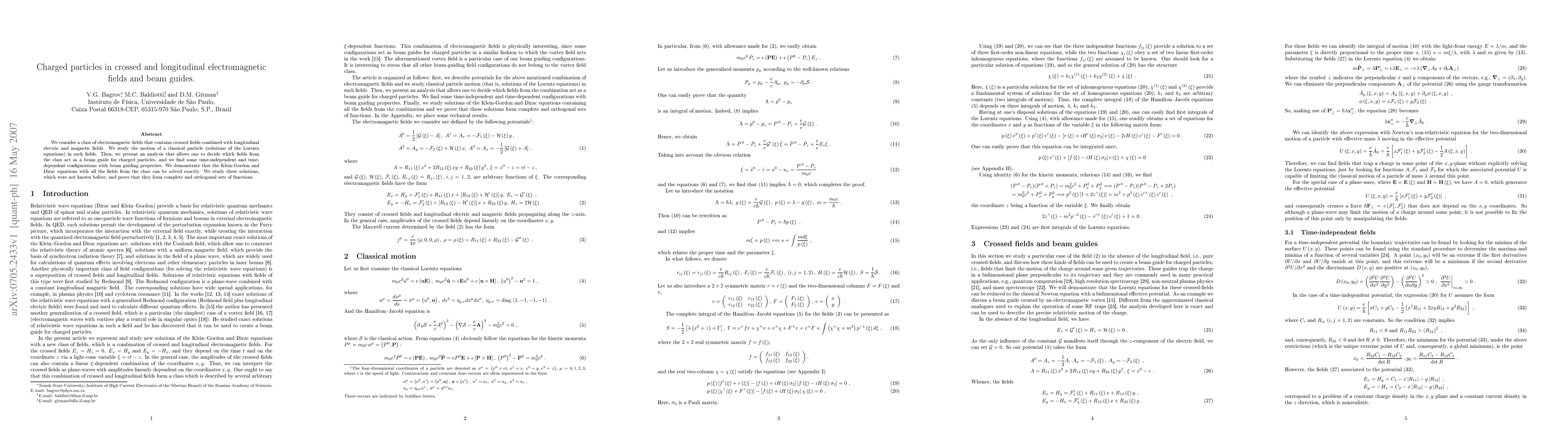 This paper investigates the motion of charged particles in electromagnetic fields combining crossed fields with longitudinal components, identifying configurations that guide beams. It also demonstrates the exact solvability of the Klein-Gordon and Dirac equations for these fields, revealing new, complete, and orthogonal sets of solutions.