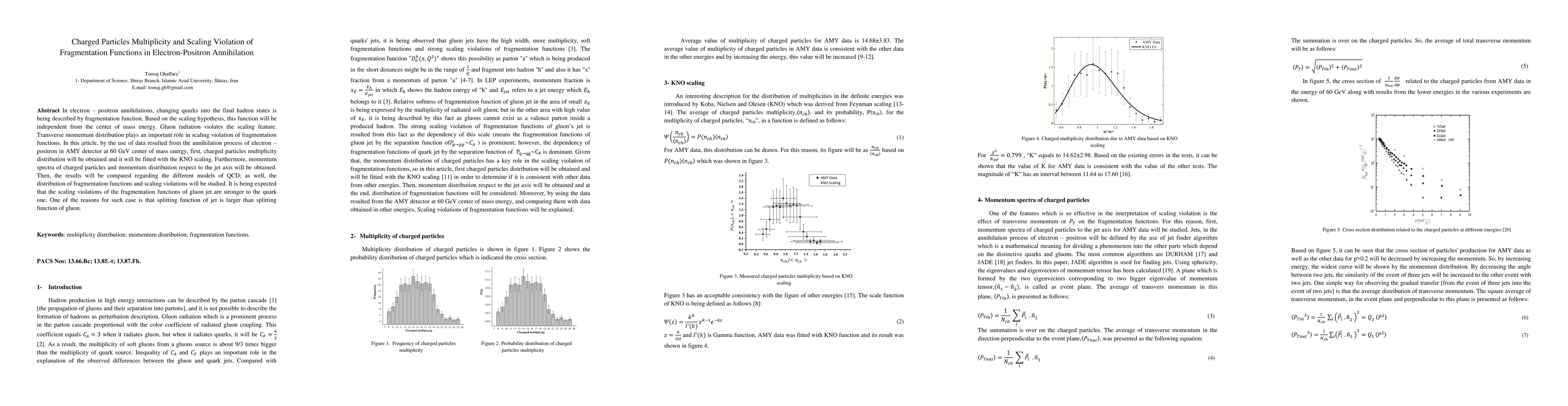 In electron positron annihilation, changing quarks into the final hadron states is being described by fragmentation function. Based on the scaling hypothesis, this function will be independent from the center of mass energy. Gluon radiation violates the scaling feature. Transverse momentum distribution plays an important role in scaling violation of fragmentation functions. In this article, by the use of data resulted from the annihilation process of electron positron in AMY detector at 60 GeV center of mass energy, first, charged particles multiplicity distribution will be obtained and it will be fitted with the KNO scaling. Furthermore, momentum spectra of charged particles and momentum distribution respect to the jet axis will be obtained. Then, the results will be compared regarding the different models of QCD; as well, the distribution of fragmentation functions and scaling violations will be studied. It is being expected that the scaling violations of the fragmentation functions of gluon jet are stronger to the quark one. One of the reasons for such case is that splitting function of jet is larger than splitting function of gluon.