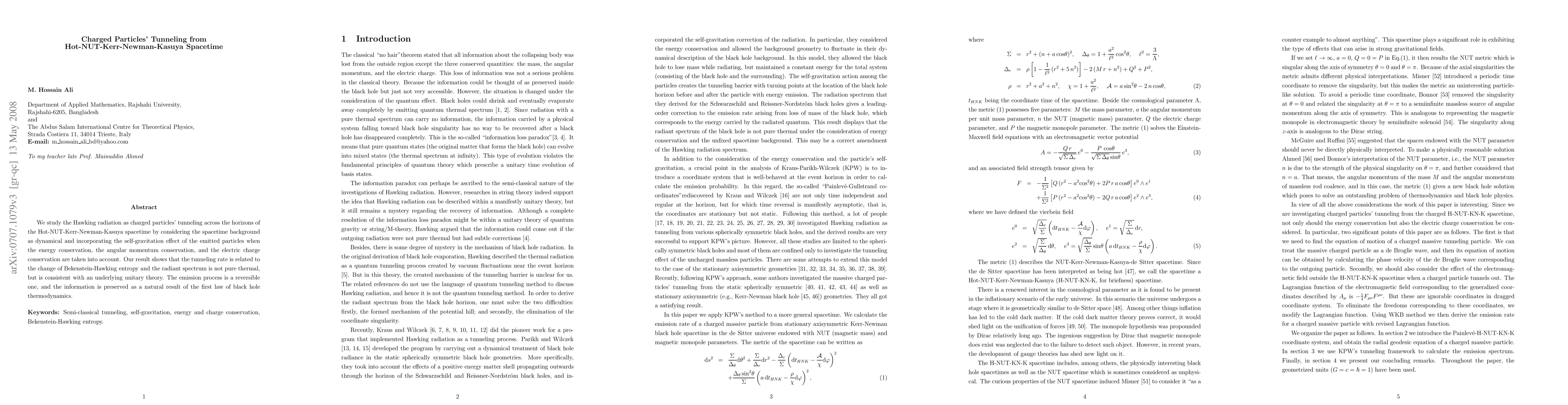 This study examines charged particle tunneling from Hot-NUT-Kerr-Newman-Kasuya black holes, considering dynamical spacetime and self-gravitation effects. The findings indicate a reversible emission process, non-thermal radiant spectrum, and preservation of information, consistent with unitary theory and black hole thermodynamics.