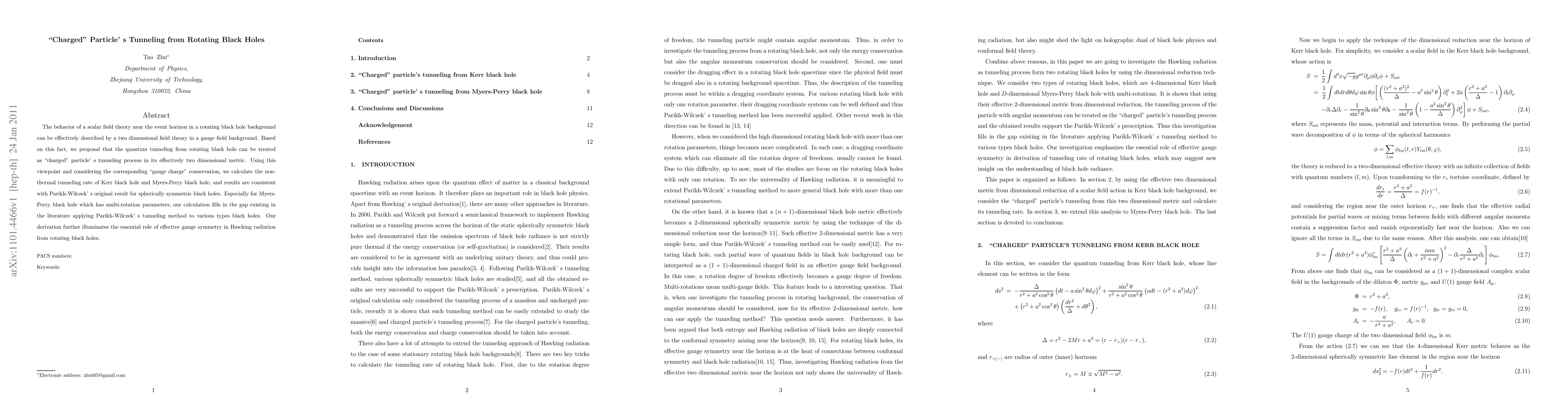 This paper proposes treating quantum tunneling from rotating black holes as a "charged" particle tunneling process in a two-dimensional field theory. It calculates the non-thermal tunneling rates for Kerr and Myers-Perry black holes, consistent with Parikh-Wilczek's results for spherically symmetric black holes, and highlights the importance of effective gauge symmetry in Hawking radiation.