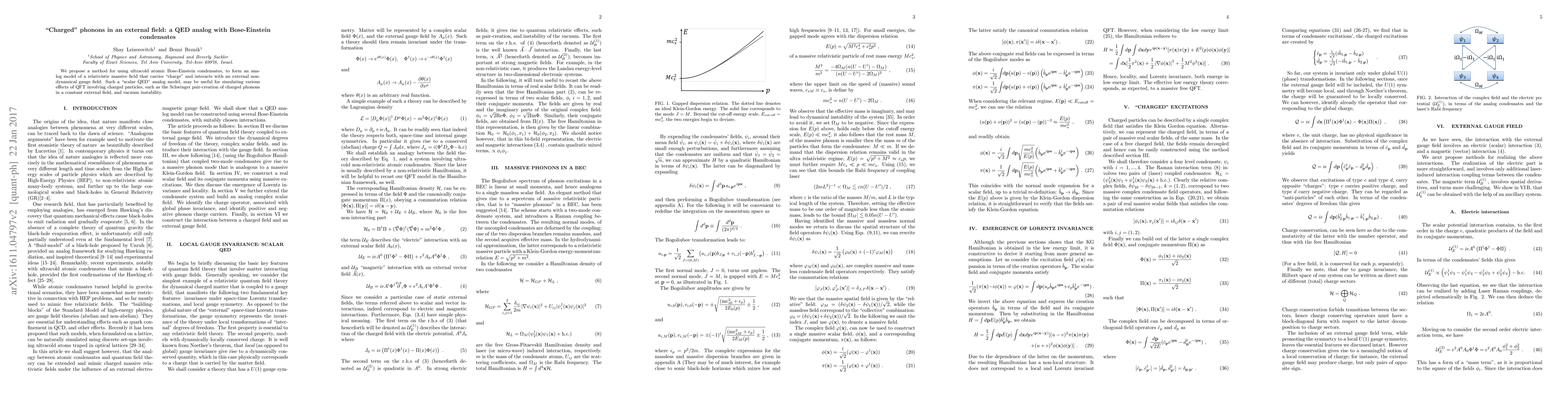 Summary: This paper proposes using ultracold atomic Bose-Einstein condensates to simulate a relativistic massive field with "charge" interacting with an external gauge field, providing a QED analog to study phenomena like Schwinger pair-creation of charged phonons and vacuum instability.