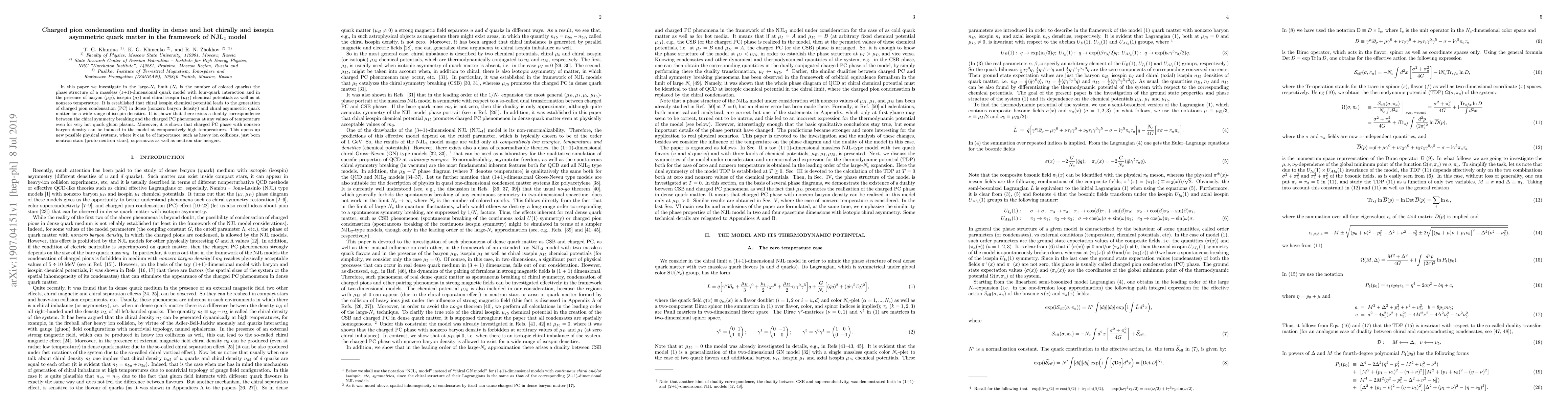 This paper explores the phase structure of a (1+1)-dimensional quark model under chiral and isospin asymmetry, revealing charged pion condensation driven by chiral isospin chemical potential. It establishes a duality between chiral symmetry breaking and charged pion condensation, even at high temperatures, suggesting potential relevance in astrophysical contexts like heavy ion collisions and neutron star phenomena.
