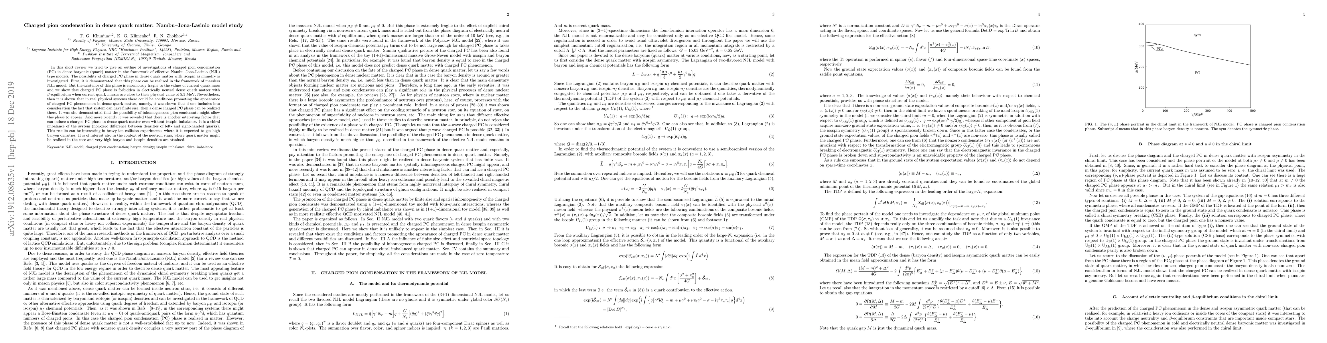 In this short review we tried to give an outline of investigations of charged pion condensation (PC) in dense baryonic (quark) matter in the framework of effective Nambu--Jona-Lasinio (NJL) type models. The possibility of charged PC phase in dense quark matter with isospin asymmetry is investigated. First, it is demonstrated that this phase can be realized in the framework of massless NJL model. But the existence of this phase is enormously fragile to the values of current quark mass %.Then, and we show that charged PC phase is forbidden in electrically neutral dense quark matter with $\beta$-equilibrium when current quark masses are close to their physical value of 5.5 MeV. Nevertheless, then it is shown that in real physical systems there could be conditions promoting the appearance of charged PC phenomenon in dense quark matter, namely, it was shown that if one includes into consideration the fact that system can have finite size, then a dense charged PC phase can be realized there. It was also demonstrated that the possibility of inhomogeneous pion condensate might allow this phase to appear. And more recently it was revealed that there is another interesting factor that can induce a charged PC phase in dense quark matter even without isospin imbalance. It is a chiral imbalance of the system (non-zero difference between densities of left- and right-handed quarks). This results can be interesting in heavy ion collision experiments, where it is expected to get high baryon densities. It is of interest also in the context of the neutron stars, where quark matter might be realized in the core and very high baryon and isospin densities are attained.
