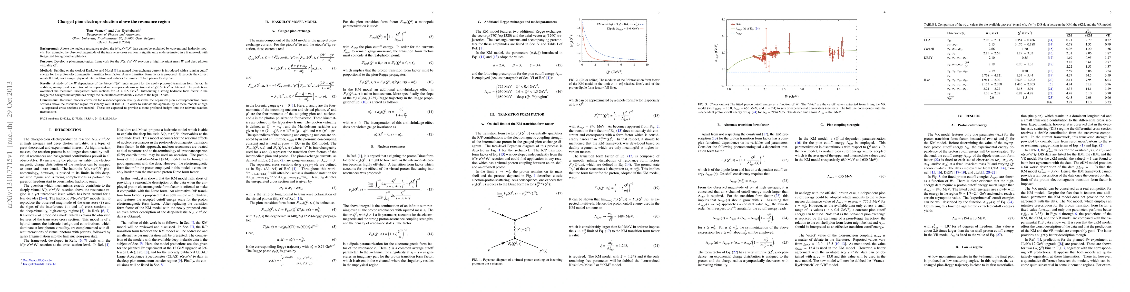 This paper develops a new phenomenological framework for charged pion electroproduction above the nucleon resonance region, introducing a gauged pion-exchange current and a new transition form factor. It shows improved agreement with experimental data for low momentum transfer but requires further validation through high momentum transfer measurements.