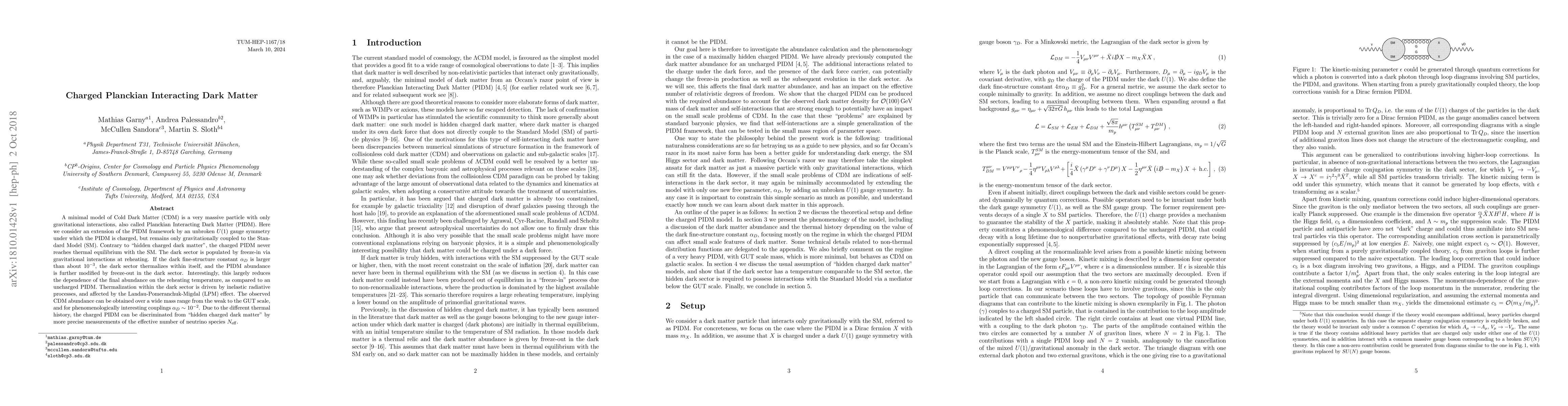 This paper proposes a charged Planckian Interacting Dark Matter (PIDM) model where the dark matter is coupled only gravitationally to the Standard Model but exhibits an unbroken $U(1)$ gauge symmetry. Unlike "hidden charged dark matter," this model avoids thermal equilibrium with the SM, leading to distinct observational signatures.
