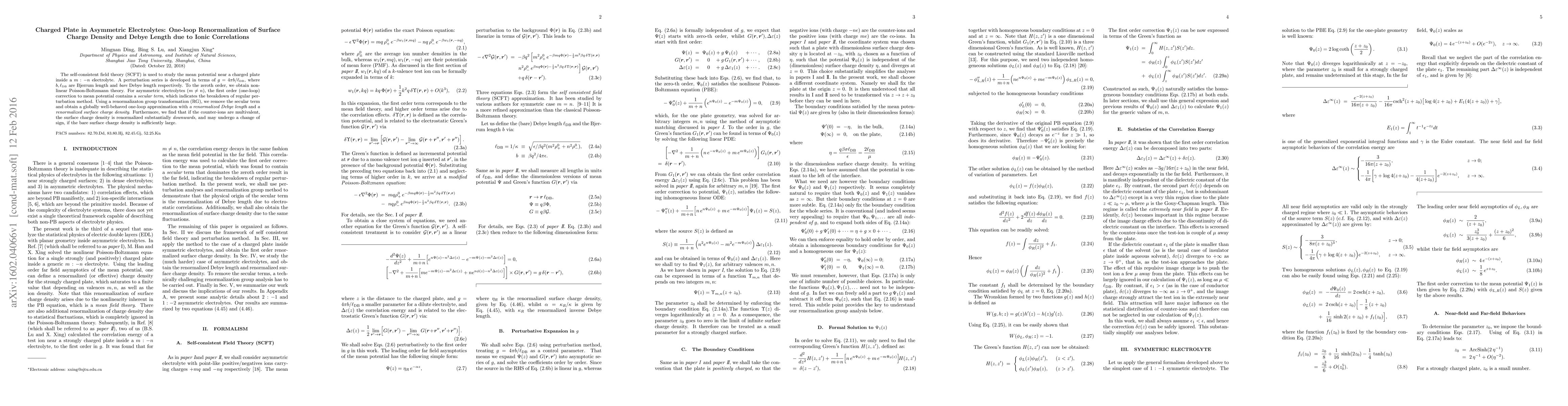 This paper employs self-consistent field theory to analyze the mean potential near a charged plate in asymmetric electrolytes, revealing a secular term in the first-order correction. Using renormalization group techniques, the authors derive a globally well-behaved one-loop approximation with renormalized Debye length and surface charge density, especially noting significant downward renormalization of surface charge density for multivalent counter-ions.