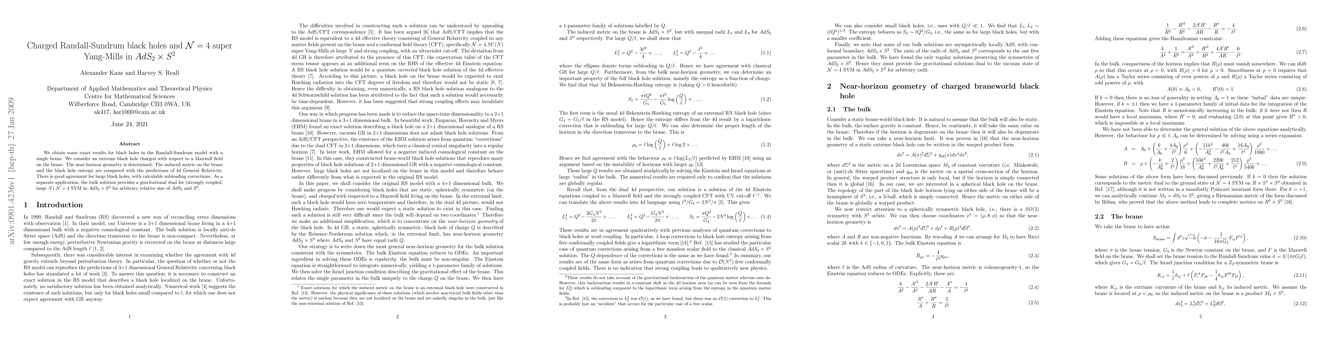This paper derives exact results for charged black holes in the Randall-Sundrum model, showing near-horizon geometry consistency with 4d General Relativity and providing a gravitational dual for N=4 super Yang-Mills in AdS(2)xS(2). The large black hole entropy calculations show good agreement with theoretical predictions.