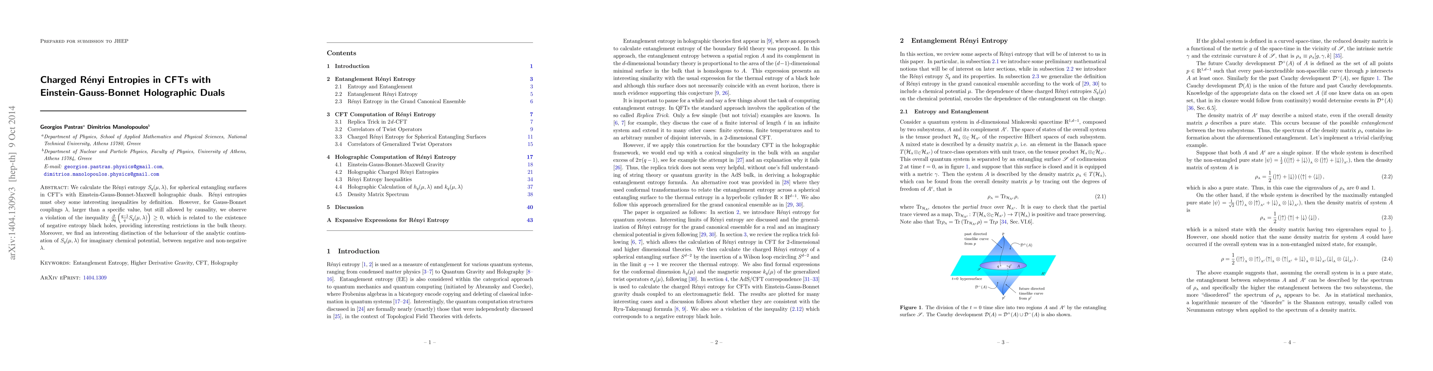 This paper calculates charged R\'enyi entropies in conformal field theories (CFTs) with Einstein-Gauss-Bonnet-Maxwell holographic duals, revealing violations of certain inequalities for specific Gauss-Bonnet couplings, indicating the existence of negative entropy black holes and highlighting the distinct behavior of the analytic continuation for imaginary chemical potential.