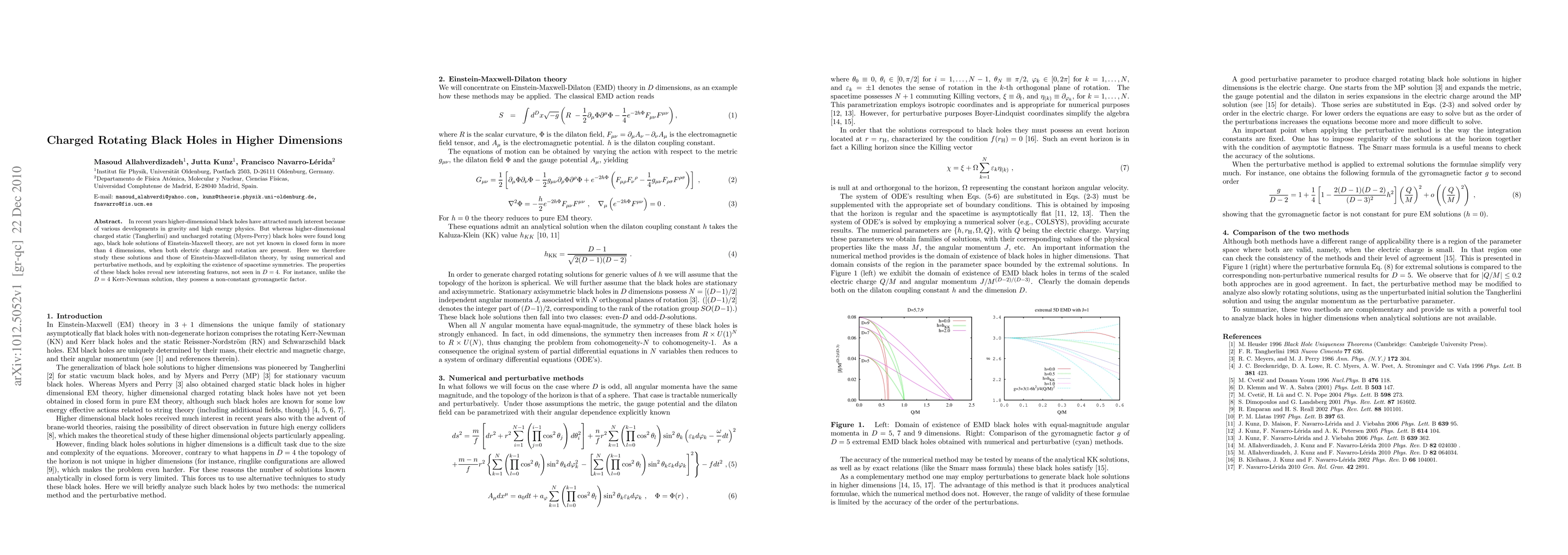 This paper explores charged rotating black holes in higher dimensions using numerical and perturbative methods, revealing novel properties such as a non-constant gyromagnetic factor, unlike their D=4 counterparts. It addresses the lack of known solutions for such black holes in more than four dimensions within Einstein-Maxwell theory.