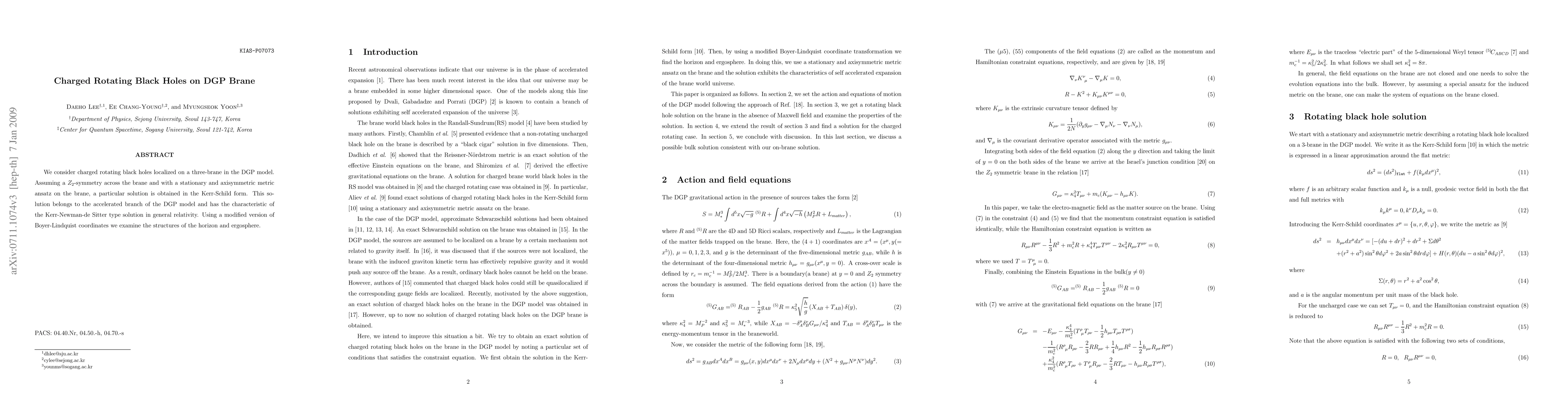 This paper explores charged rotating black holes in the DGP braneworld model, deriving a Kerr-Schild solution that belongs to the accelerated branch. The study examines the horizon and ergosphere structures using modified Boyer-Lindquist coordinates.