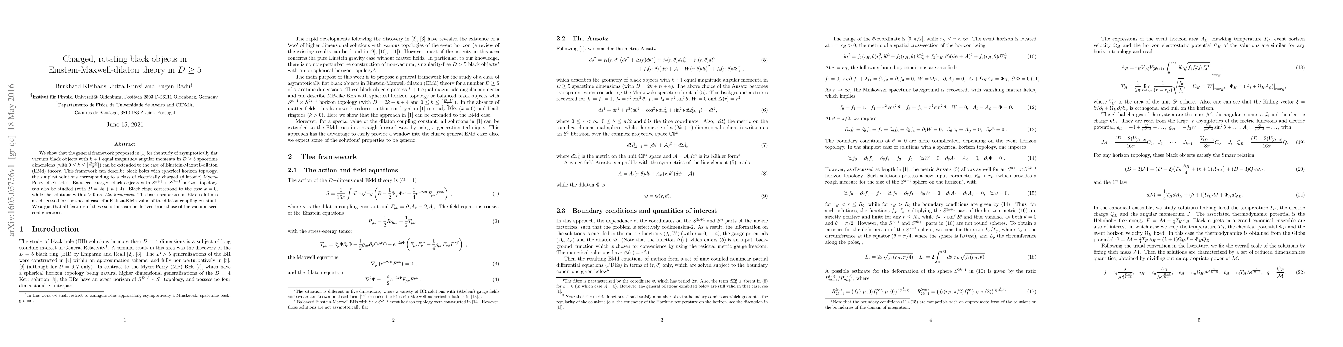 This paper extends the framework for studying asymptotically flat vacuum black objects to Einstein-Maxwell-dilaton theory in $D\geq 5$ dimensions, describing charged black holes and rings, including Myers-Perry black holes and black ringoids, and discusses their properties. The solutions' features are derived from their vacuum seed configurations.