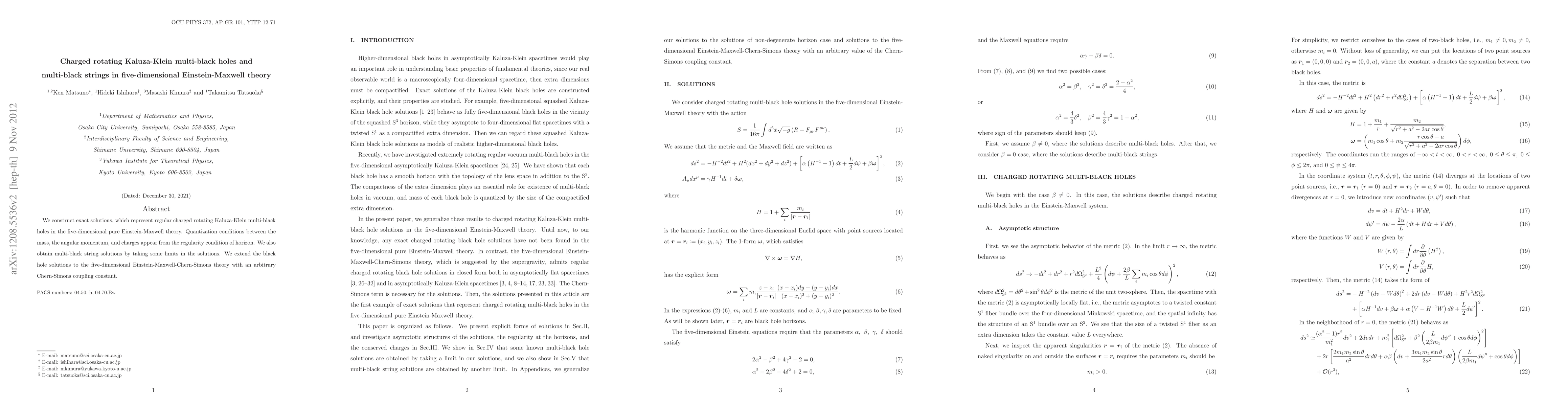 We construct exact solutions, which represent regular charged rotating Kaluza-Klein multi-black holes in the five-dimensional pure Einstein-Maxwell theory. Quantization conditions between the mass, the angular momentum, and charges appear from the regularity condition of horizon. We also obtain multi-black string solutions by taking some limits in the solutions. We extend the black hole solutions to the five-dimensional Einstein-Maxwell-Chern-Simons theory with an arbitrary Chern-Simons coupling constant.