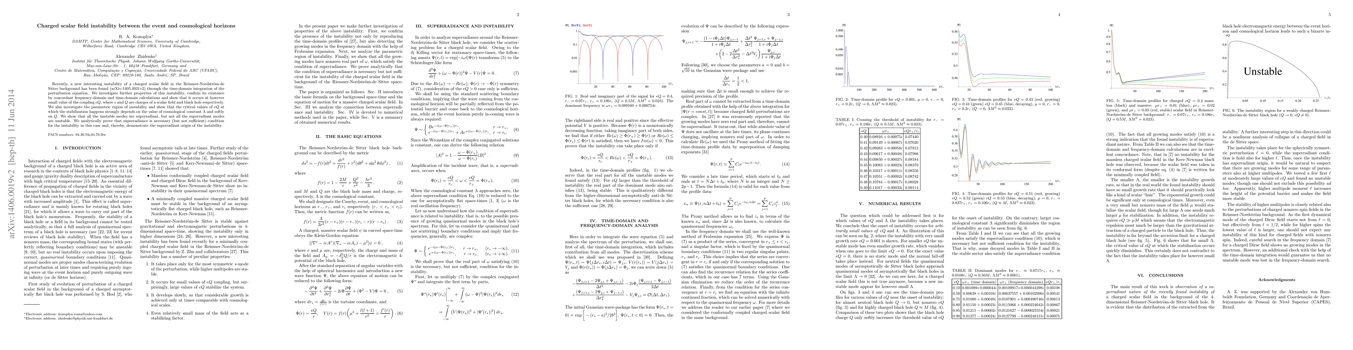 Recently, a new interesting instability of a charged scalar field in the Reissner-Nordstr\"om-de Sitter background has been found (arXiv:1405.4931v2) through the time-domain integration of the perturbation equation. We investigate further properties of this instability, confirm its existence by concordant frequency-domain and time-domain calculations and show that it occurs at however small value of the coupling eQ, where e and Q are charges of a scalar field and black hole respectively. We also investigate the parametric region of instability and show that the critical values of eQ at which the stabilization happens strongly depends on the value of cosmological constant $\Lambda$ and softly on Q. We show that all the unstable modes are superradiant, but not all the superradiant modes are unstable. We analytically prove that superradiance is necessary (but not sufficient) condition for the instability in this case and, thereby, demonstrate the superradiant origin of the instability.