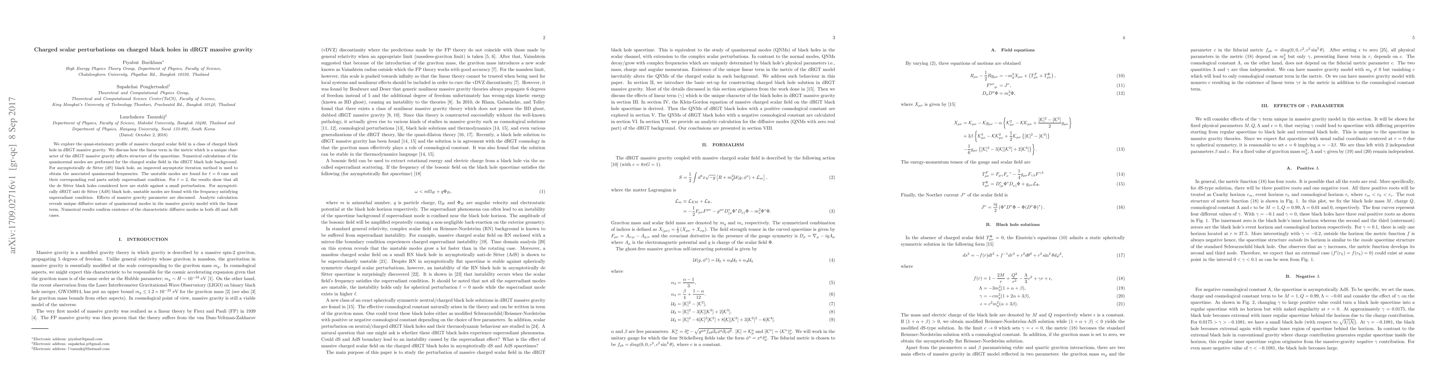 We explore the quasi-stationary profile of massive charged scalar field in a class of charged black hole in dRGT massive gravity. We discuss how the linear term in the metric which is a unique character of the dRGT massive gravity affects structure of the spacetime. Numerical calculations of the quasinormal modes are performed for the charged scalar field in the dRGT black hole background. For asymptotically de Sitter (dS) black hole, an improved asymptotic iteration method is used to obtain the associated quasinormal frequencies. The unstable modes are found for $\ell=0$ case and their corresponding real parts satisfy superradiant condition. For $\ell=2$, the results show that all the de Sitter black holes considered here are stable against a small perturbation. For asymptotically dRGT anti de Sitter (AdS) black hole, unstable modes are found with the frequency satisfying superradiant condition. Effects of massive gravity parameter are discussed. Analytic calculation reveals unique diffusive nature of quasinormal modes in the massive gravity model with the linear term. Numerical results confirm existence of the characteristic diffusive modes in both dS and AdS cases.
