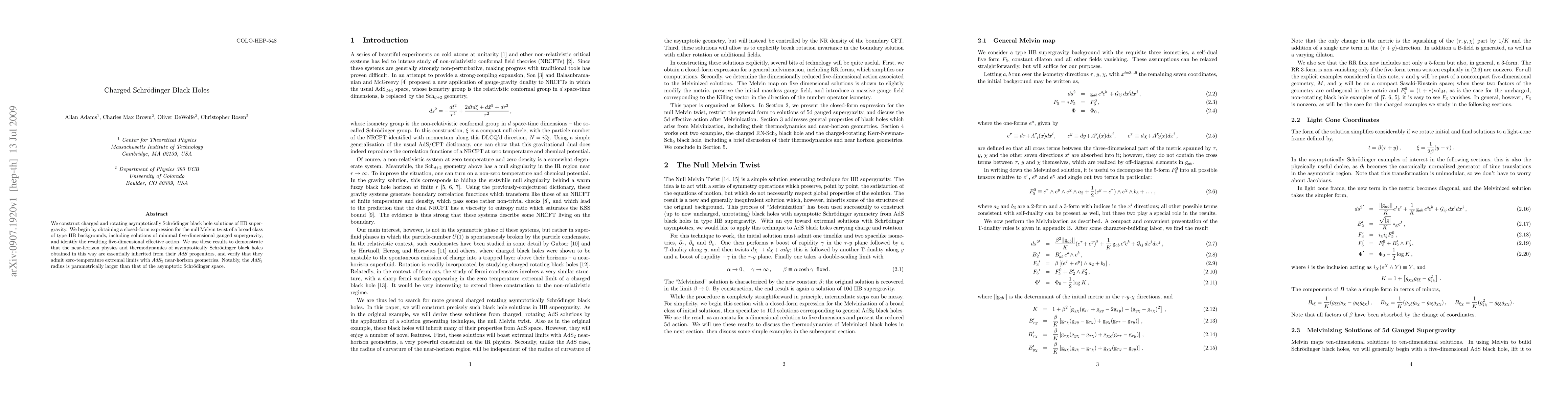 We construct charged and rotating asymptotically Schrodinger black hole solutions of IIB supergravity. We begin by obtaining a closed-form expression for the null Melvin twist of a broad class of type IIB backgrounds, including solutions of minimal five-dimensional gauged supergravity, and identify the resulting five-dimensional effective action. We use these results to demonstrate that the near-horizon physics and thermodynamics of asymptotically Schrodinger black holes obtained in this way are essentially inherited from their AdS progenitors, and verify that they admit zero-temperature extremal limits with AdS_2 near-horizon geometries. Notably, the AdS_2 radius is parametrically larger than that of the asymptotic Schrodinger space.