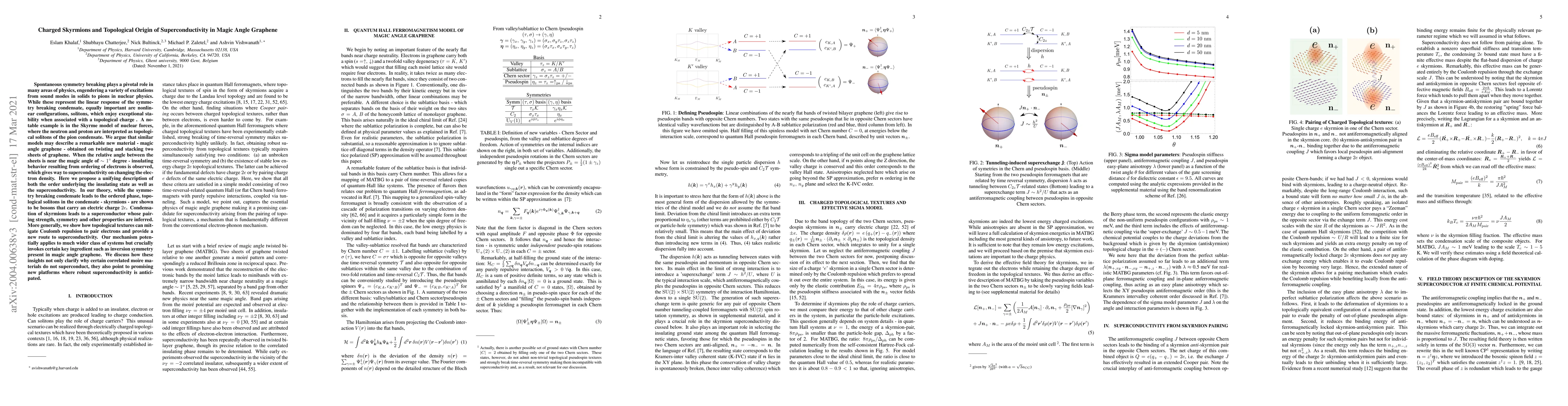 This paper proposes that charged skyrmions, topological solitons in the symmetry breaking condensate of magic angle graphene, can condense to form a superconductor. The topological nature of these skyrmions mitigates Coulomb repulsion, offering a novel pathway to superconductivity in this unique material.