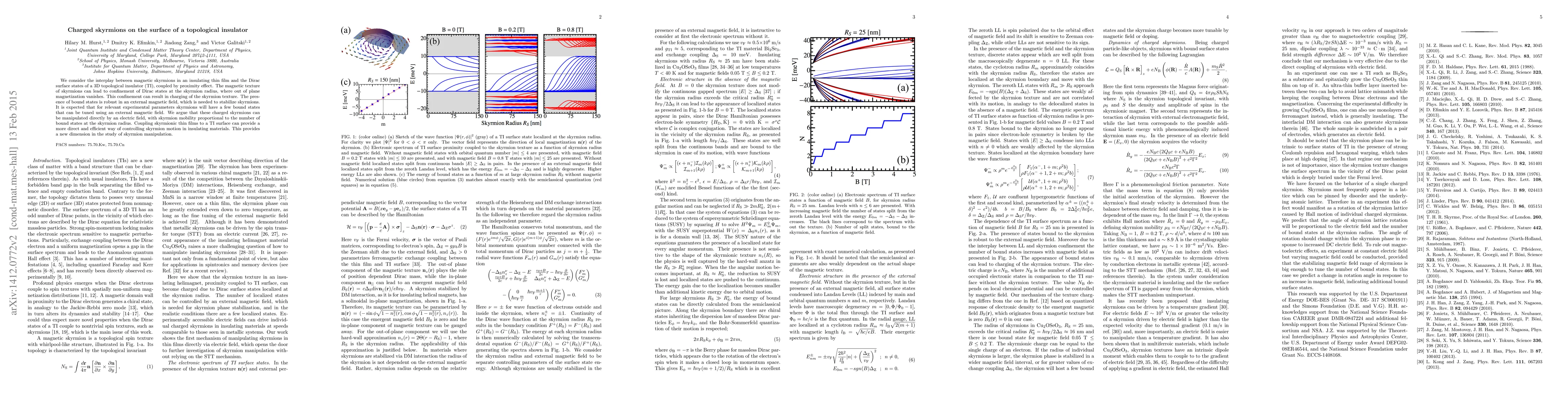 We consider the interplay between magnetic skyrmions in an insulating thin film and the Dirac surface states of a 3D topological insulator (TI), coupled by proximity effect. The magnetic texture of skyrmions can lead to confinement of Dirac states at the skyrmion radius, where out of plane magnetization vanishes. This confinement can result in charging of the skyrmion texture. The presence of bound states is robust in an external magnetic field, which is needed to stabilize skyrmions. It is expected that for relevant experimental parameters skyrmions will have a few bound states that can be tuned using an external magnetic field. We argue that these charged skyrmions can be manipulated directly by an electric field, with skyrmion mobility proportional to the number of bound states at the skyrmion radius. Coupling skyrmionic thin films to a TI surface can provide a more direct and efficient way of controlling skyrmion motion in insulating materials. This provides a new dimension in the study of skyrmion manipulation.