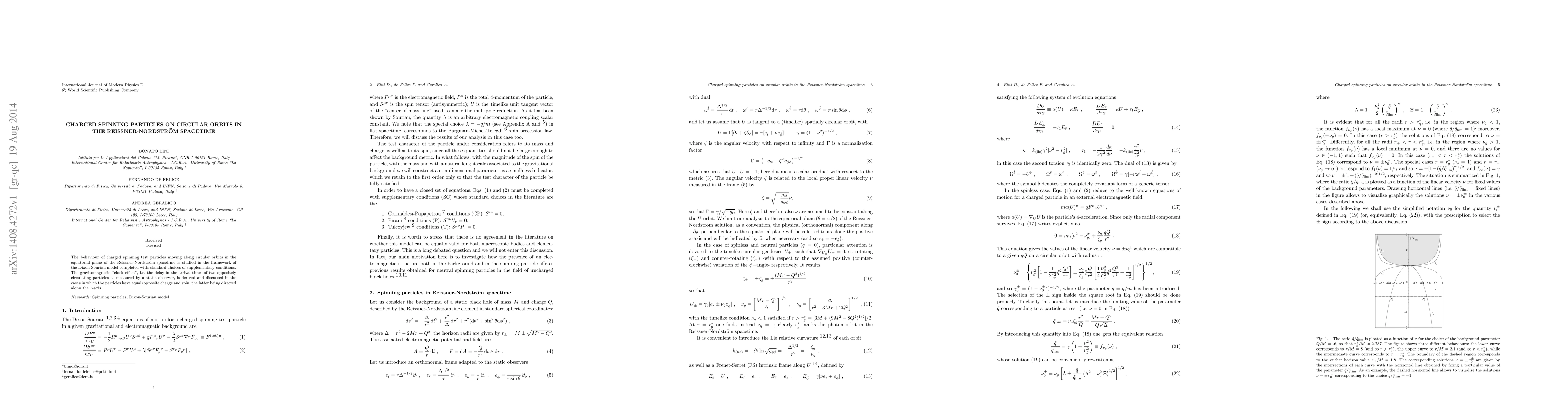 This paper investigates the dynamics of charged spinning particles on circular orbits in the Reissner-Nordström spacetime, focusing on the Dixon-Souriau model. It derives the gravitomagnetic "clock effect" for particles with equal/opposite charge and spin, analyzing the delay in arrival times as measured by a static observer.
