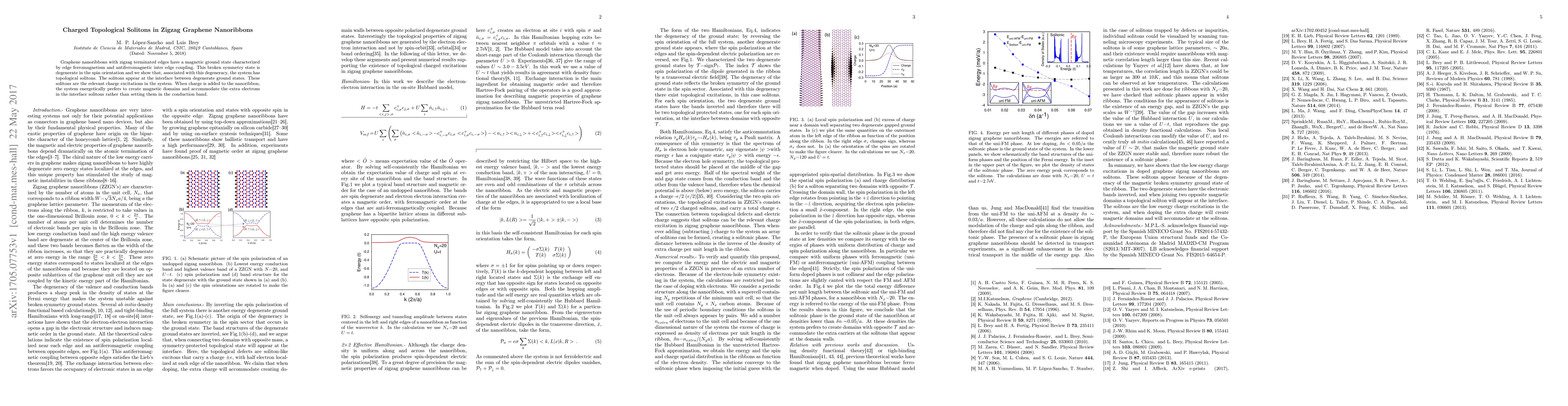 Graphene nanoribbons with zigzag terminated edges have a magnetic ground state characterized by edge ferromagnetism and antiferromagnetic inter edge coupling. This broken symmetry state is degenerate in the spin orientation and we show that, associated with this degeneracy, the system has topological solitons. The solitons appear at the interface between degenerate ground states. These solitons are the relevant charge excitations in the system. When charge is added to the nanoribbon, the system energetically prefers to create magnetic domains and accommodate the extra electrons in the interface solitons rather than setting them in the conduction band.