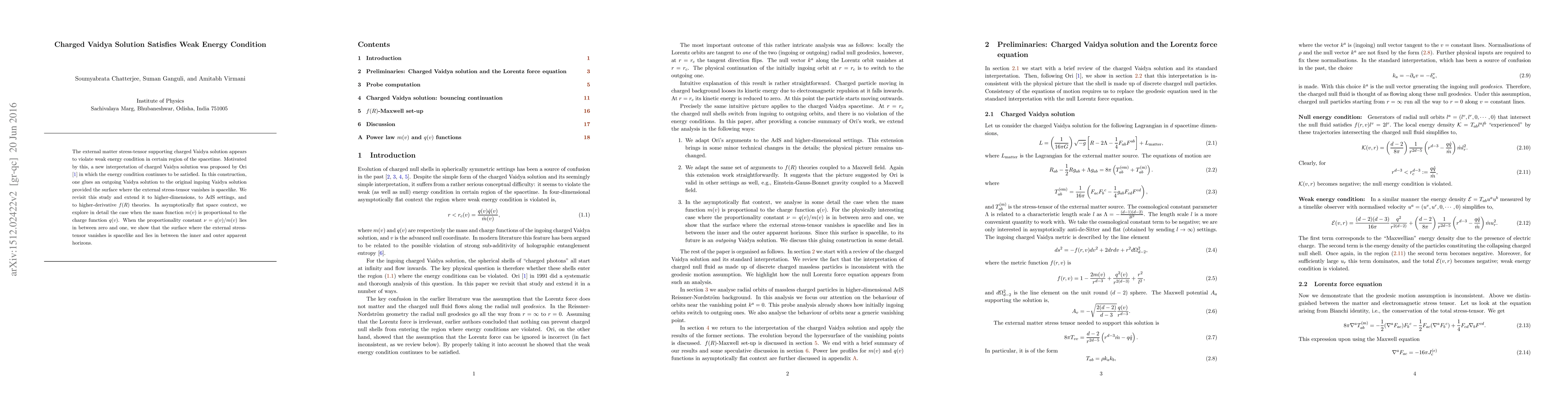 The external matter stress-tensor supporting charged Vaidya solution appears to violate weak energy condition in certain region of the spacetime. Motivated by this, a new interpretation of charged Vaidya solution was proposed by Ori [1] in which the energy condition continues to be satisfied. In this construction, one glues an outgoing Vaidya solution to the original ingoing Vaidya solution provided the surface where the external stress-tensor vanishes is spacelike. We revisit this study and extend it to higher-dimensions, to AdS settings, and to higher-derivative f(R) theories. In asymptotically flat space context, we explore in detail the case when the mass function m(v) is proportional to the charge function q(v). When the proportionality constant \nu = q(v)/m(v) lies in between zero and one, we show that the surface where the external stress-tensor vanishes is spacelike and lies in between the inner and outer apparent horizons.