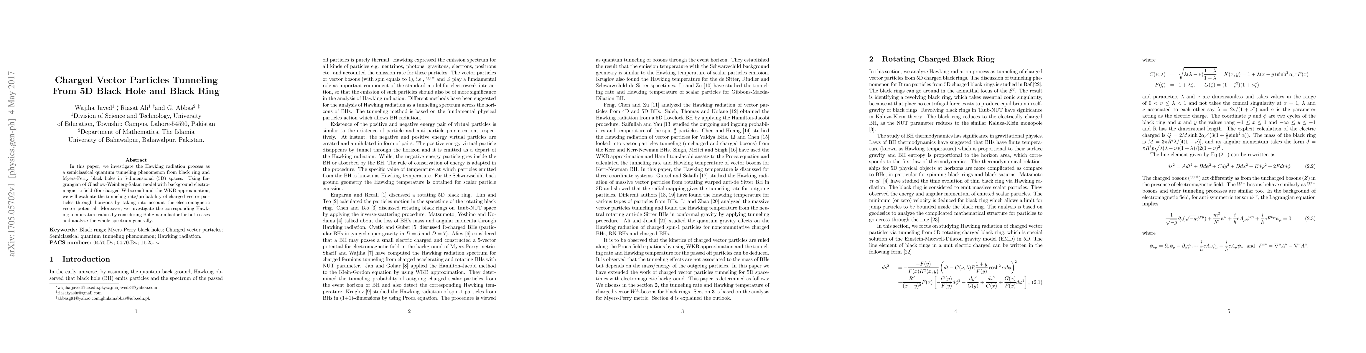 This paper explores the Hawking radiation of charged vector particles tunneling from 5D black holes and black rings via quantum tunneling. Using the Glashow-Weinberg-Salam model and WKB approximation, it calculates the tunneling rate and evaluates the corresponding Hawking temperatures.
