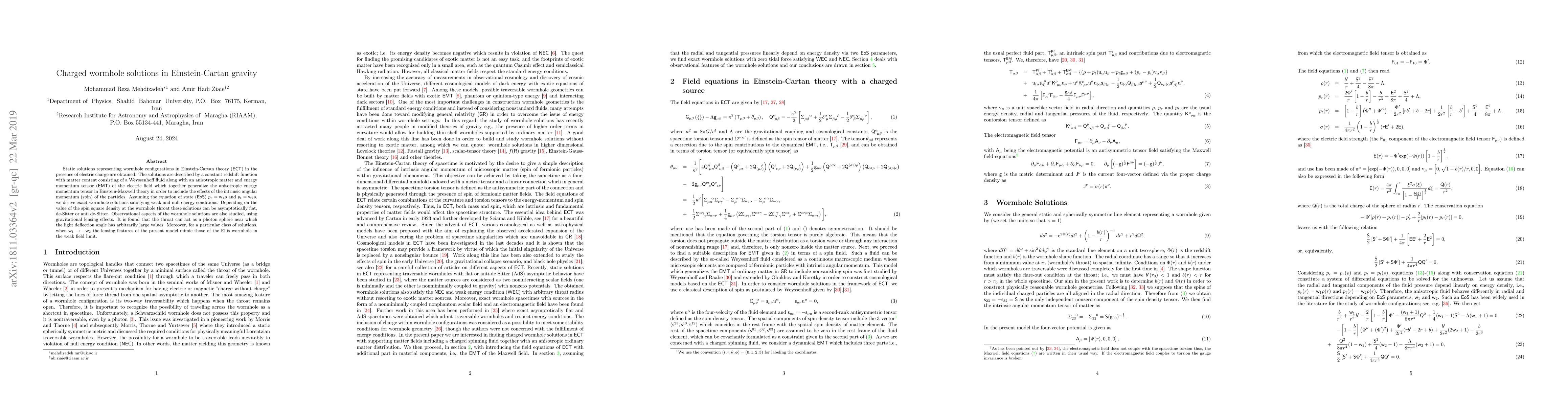 Static solutions representing wormhole configurations in Einstein-Cartan theory ({{\sf ECT}}) in the presence of electric charge are obtained. The solutions are described by a constant redshift function with matter content consisting of a Weyssenhoff fluid along with an anisotropic matter and energy momentum tensor ({\sf EMT}) of the electric field which together generalize the anisotropic energy momentum tensor in Einstein-Maxwell theory in order to include the effects of the intrinsic angular momentum (spin) of the particles. Assuming the equation of state ({{\sf EoS}}) $p_r={\sf w}_1\rho$ and $p_t={\sf w}_2\rho$, we derive exact wormhole solutions satisfying weak and null energy conditions. Depending on the value of the spin square density at the wormhole throat these solutions can be asymptotically flat, de-Sitter or anti de-Sitter. Observational aspects of the wormhole solutions are also studied, using gravitational lensing effects. It is found that the throat can act as a photon sphere near which the light deflection angle has arbitrarily large values. Moreover, for a particular class of solutions, when ${\sf w}_1\rightarrow-{\sf w}_2$ the lensing features of the present model mimic those of the Ellis wormhole in the weak field limit.