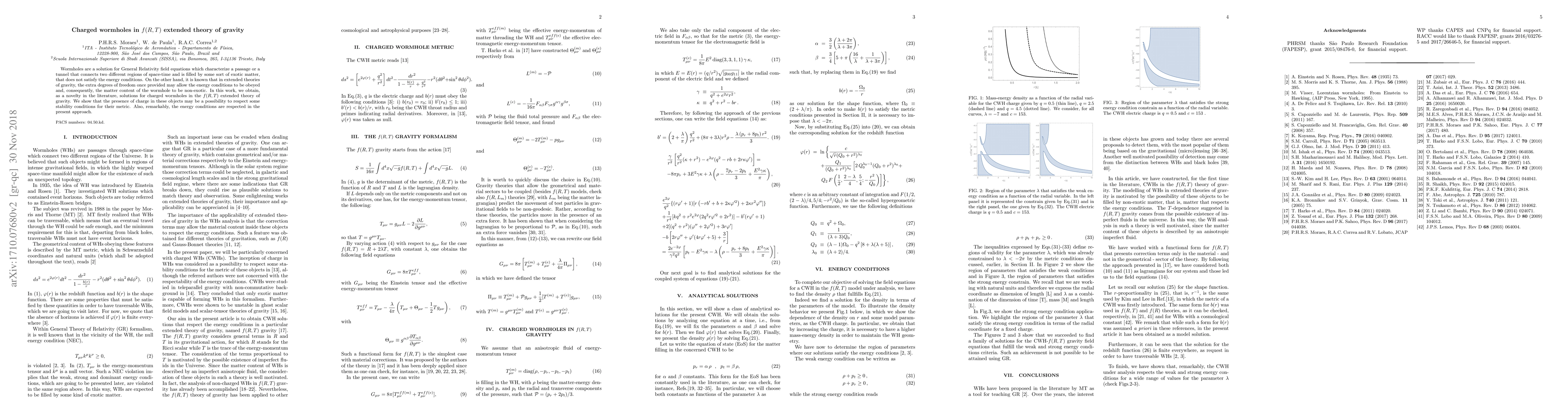 Wormholes are a solution for General Relativity field equations which characterize a passage or a tunnel that connects two different regions of space-time and is filled by some sort of exotic matter, that does not satisfy the energy conditions. On the other hand, it is known that in extended theories of gravity, the extra degrees of freedom once provided may allow the energy conditions to be obeyed and, consequently, the matter content of the wormhole to be non-exotic. In this work, we obtain, as a novelty in the literature, solutions for charged wormholes in the $f(R,T)$ extended theory of gravity. We show that the presence of charge in these objects may be a possibility to respect some stability conditions for their metric. Also, remarkably, the energy conditions are respected in the present approach.