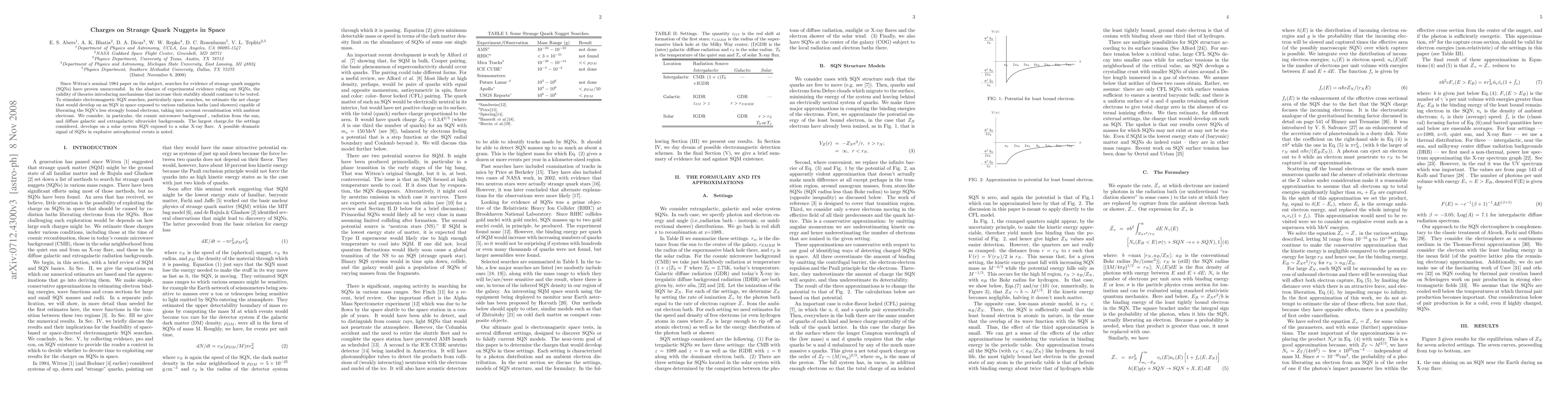 Since Witten's seminal 1984 paper on the subject, searches for evidence of strange quark nuggets (SQNs) have proven unsuccessful. In the absence of experimental evidence ruling out SQNs, the validity of theories introducing mechanisms that increase their stability should continue to be tested. To stimulate electromagnetic SQN searches, particularly space searches, we estimate the net charge that would develop on an SQN in space exposed to various radiation baths (and showers) capable of liberating their less strongly bound electrons, taking into account recombination with ambient electrons. We consider, in particular, the cosmic background radiation, radiation from the sun, and diffuse galactic and extragalactic $\gamma $-ray backgrounds. A possible dramatic signal of SQNs in explosive astrophysical events is noted.