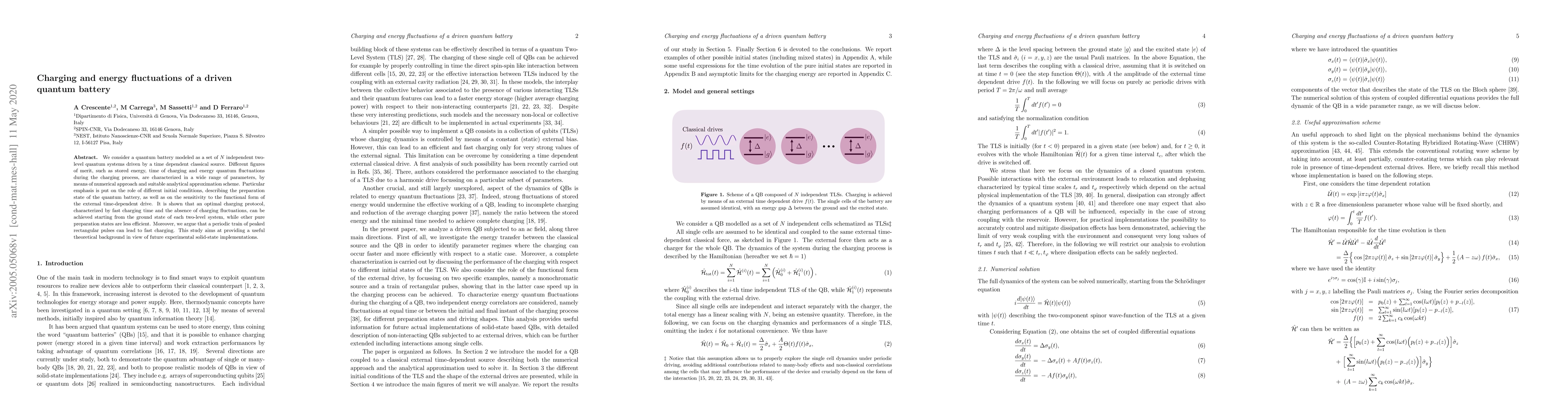This paper investigates the charging dynamics of a quantum battery composed of N independent two-level quantum systems, focusing on stored energy, charging time, and energy fluctuations. It finds that optimal charging, with minimal fluctuations, is achieved when starting from the ground state, while periodic rectangular pulses enhance the charging speed, offering theoretical insights for future solid-state quantum battery experiments.