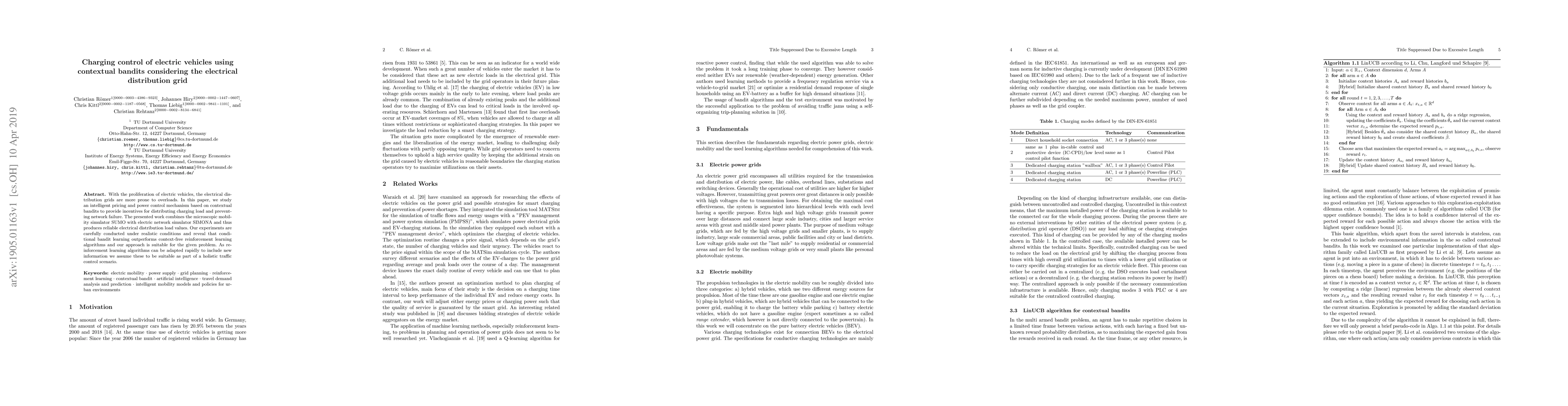 With the proliferation of electric vehicles, the electrical distribution grids are more prone to overloads. In this paper, we study an intelligent pricing and power control mechanism based on contextual bandits to provide incentives for distributing charging load and preventing network failure. The presented work combines the microscopic mobility simulator SUMO with electric network simulator SIMONA and thus produces reliable electrical distribution load values. Our experiments are carefully conducted under realistic conditions and reveal that conditional bandit learning outperforms context-free reinforcement learning algorithms and our approach is suitable for the given problem. As reinforcement learning algorithms can be adapted rapidly to include new information we assume these to be suitable as part of a holistic traffic control scenario.