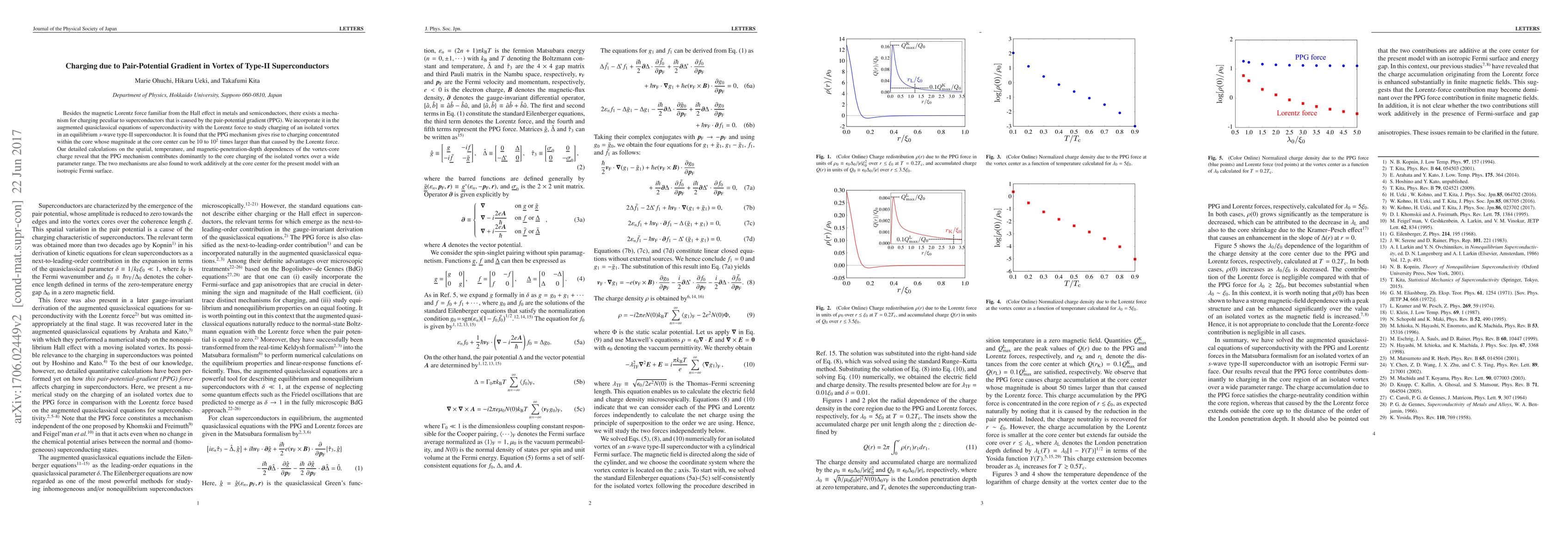 Besides the magnetic Lorentz force familiar from the Hall effect in metals and semiconductors, there exists a mechanism for charging peculiar to superconductors that is caused by the pair-potential gradient (PPG). We incorporate it in the augmented quasiclassical equations of superconductivity with the Lorentz force to study charging of an isolated vortex in an equilibrium s-wave type-II superconductor. It is found that the PPG mechanism gives rise to charging concentrated within the core whose magnitude at the core center can be 10 to 100 times larger than that caused by the Lorentz force. Our detailed calculations on the spatial, temperature, and magnetic-penetration-depth dependences of the vortex-core charge reveal that the PPG mechanism contributes dominantly to the core charging of the isolated vortex over a wide parameter range. The two mechanisms are also found to work additively at the core center for the present model with an isotropic Fermi surface.