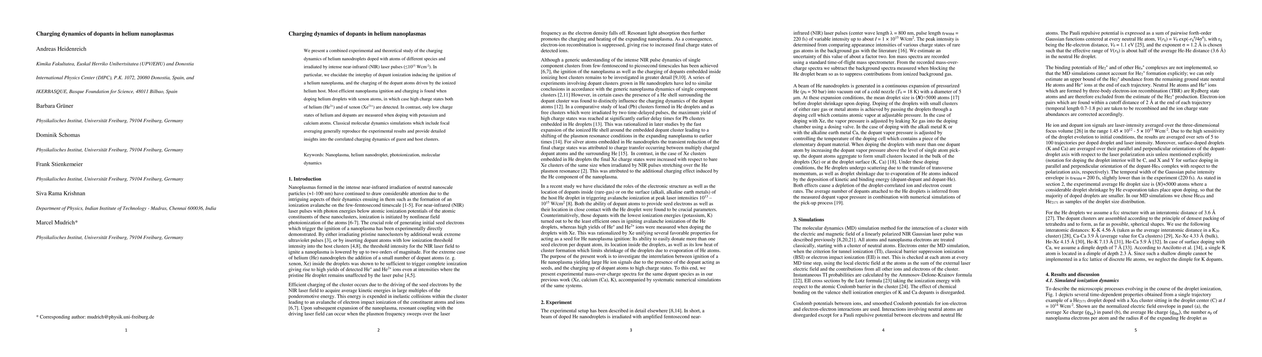 This study investigates the charging dynamics of helium nanodroplets doped with various atoms and exposed to intense NIR laser pulses, revealing that xenon doping leads to the most efficient nanoplasma ignition and high charge states, while potassium and calcium doping results in lower charge states. Classical molecular dynamics simulations corroborate these findings.