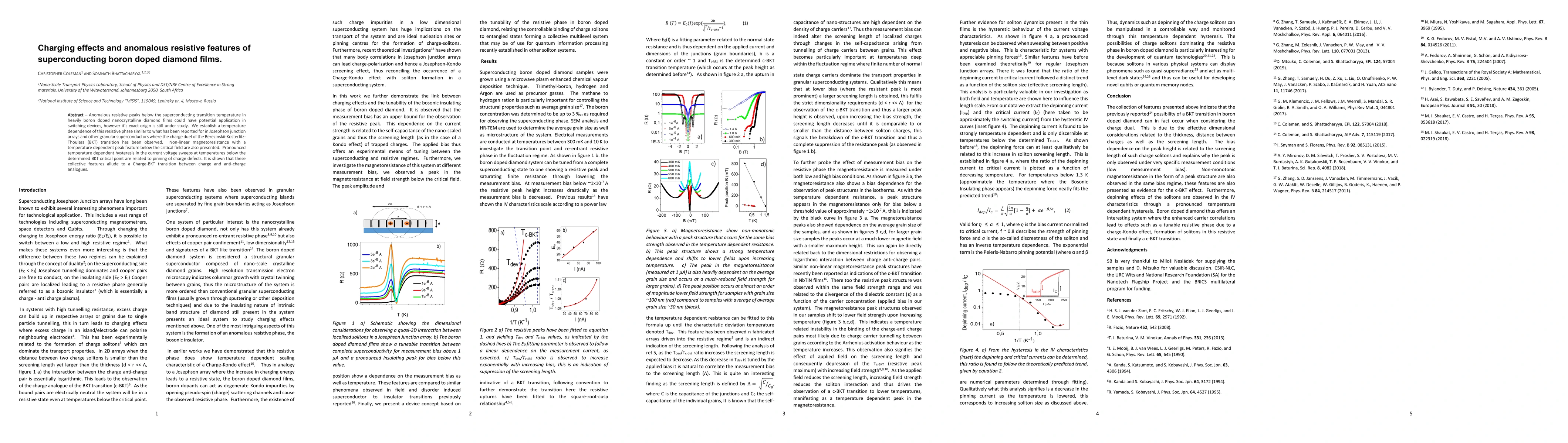 This study investigates anomalous resistive peaks in boron-doped diamond films, revealing a temperature-dependent resistive phase akin to granular superconductors. The findings suggest a Charge-BKT transition linked to pinning of charge defects, indicating potential for use in switching devices.