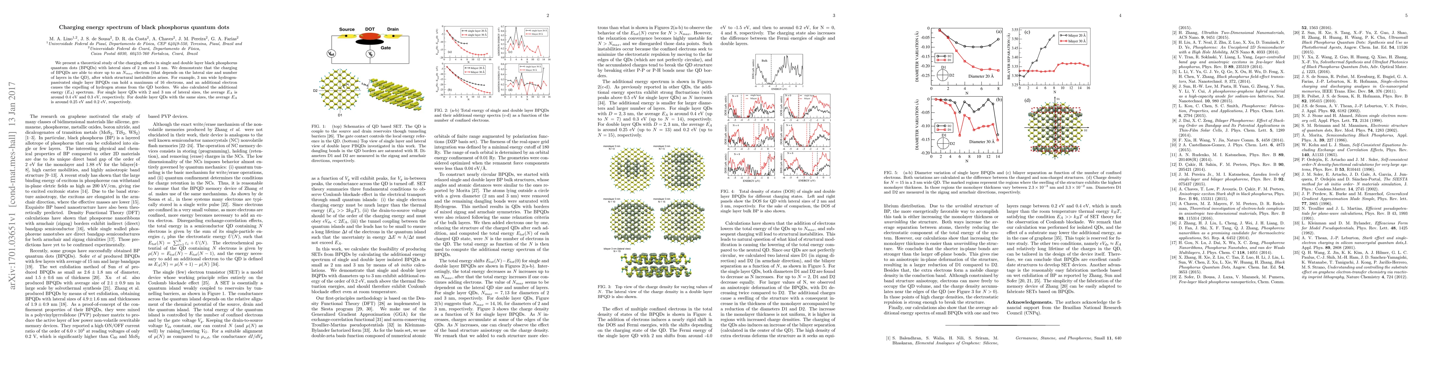 This study investigates the charging effects in black phosphorus quantum dots (BPQDs) of varying sizes, revealing that they can store up to a maximum number of electrons before structural instabilities occur, such as hydrogen atom expulsion. The additional energy spectrum shows single layer QDs store 0.4 eV and 0.3 eV on average for 2 nm and 3 nm sizes, respectively, while double layer QDs store 0.25 eV and 0.2 eV for the same sizes.