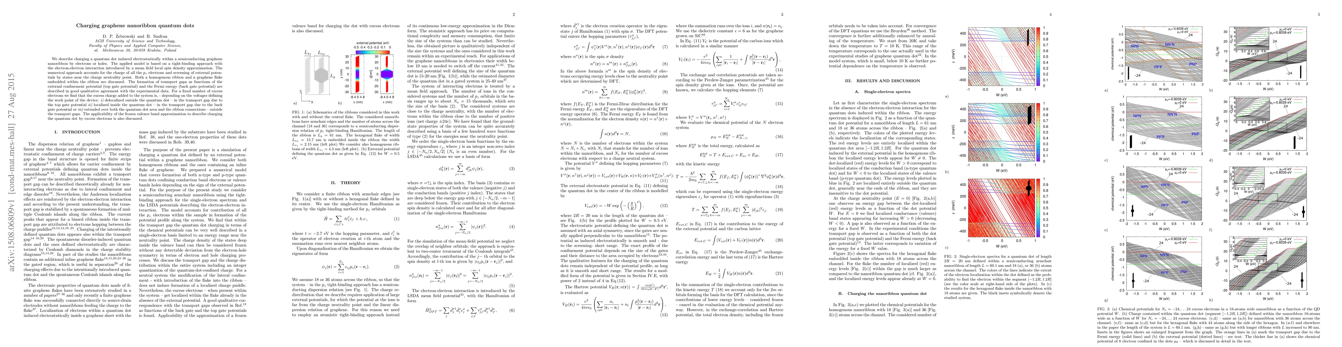 We describe charging a quantum dot induced electrostatically within a semiconducting graphene nanoribbon by electrons or holes. The applied model is based on a tight-binding approach with the electron-electron interaction introduced by a mean field local spin density approximation. The numerical approach accounts for the charge of all the $p_z$ electrons and screening of external potentials by states near the charge neutrality point. Both a homogenous ribbon and a graphene flake embedded within the ribbon are discussed. The formation of transport gaps as functions of the external confinement potential (top gate potential) and the Fermi energy (back gate potential) are described in good qualitative agreement with the experimental data. For a fixed number of excess electrons we find that the excess charge added to the system is, - depending on the voltages defining the work point of the device: $(i)$ delocalized outside the quantum dot, - in the transport gap due to the top gate potential $(ii)$ localized inside the quantum dot, - in the transport gap due to the back gate potential or $(iii)$ extended over both the quantum dot area and the ribbon connections, - outside the transport gaps. The applicability of the frozen valence band approximation to describe charging the quantum dot by excess electrons is also discussed.