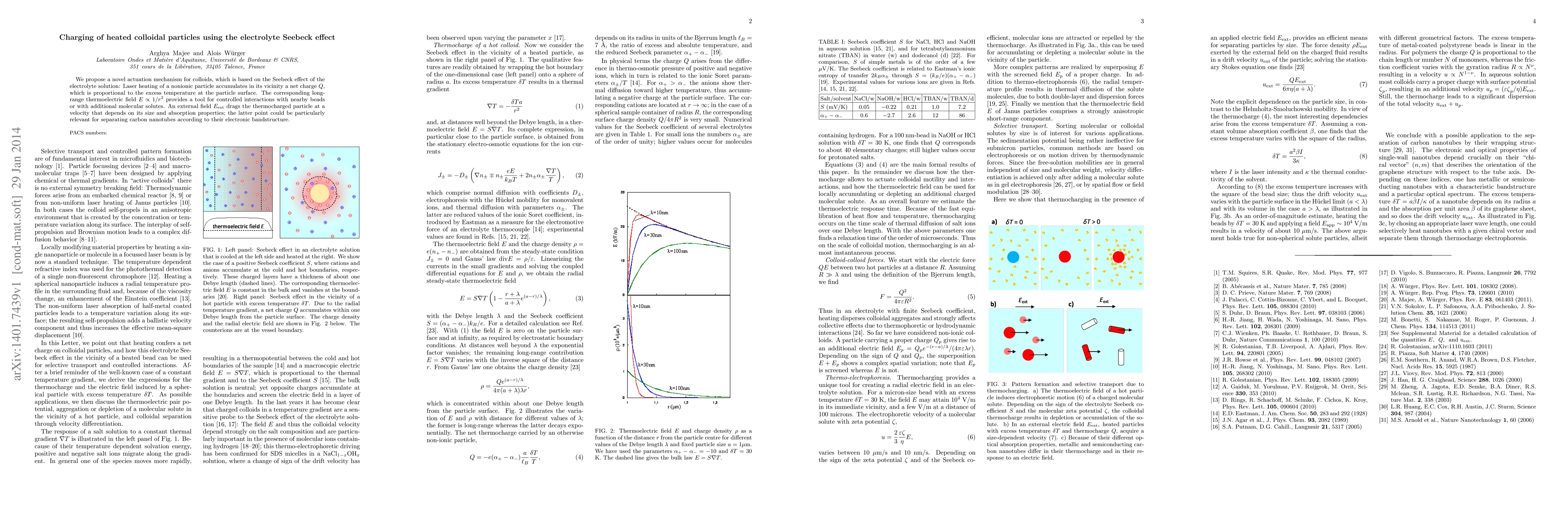 We propose a novel actuation mechanism for colloids, which is based on the Seebeck effect of the electrolyte solution: Laser heating of a nonionic particle accumulates in its vicinity a net charge Q, which is proportional to the excess temperature at the particle surface. The corresponding long-range thermoelectric field provides a tool for controlled interactions with nearby beads or with additional molecular solutes. An external field Eext drags the thermocharged particle at a velocity that depends on its size and absorption properties; the latter point could be particularly relevant for separating carbon nanotubes according to their electronic band structure.