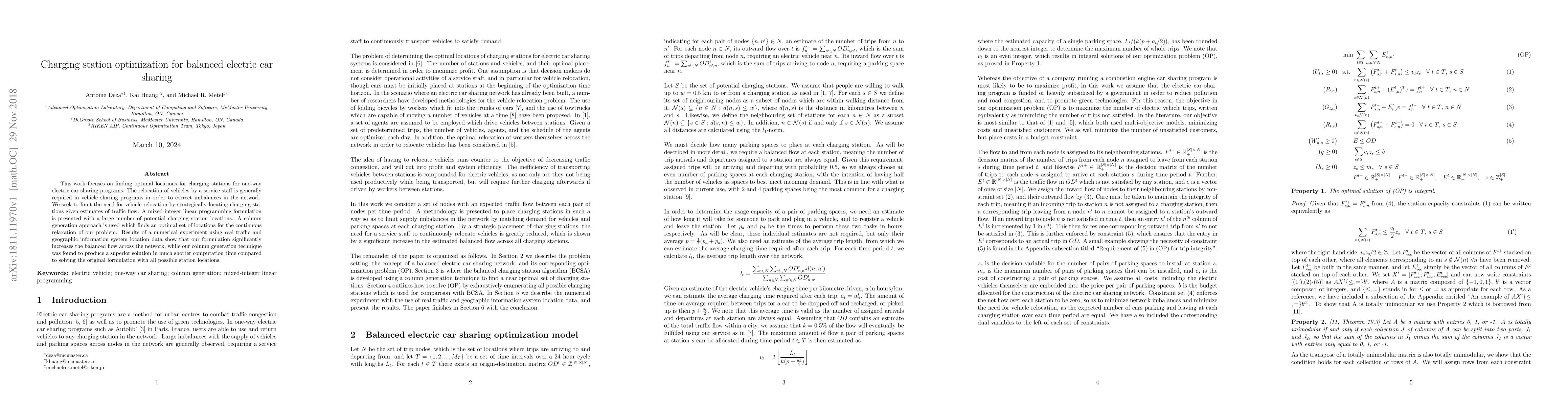 This paper proposes a mixed-integer linear programming model to optimize charging station locations for electric car sharing, aiming to minimize vehicle relocation needs. Using a column generation approach, the study demonstrates significant improvements in network balance and computational efficiency.