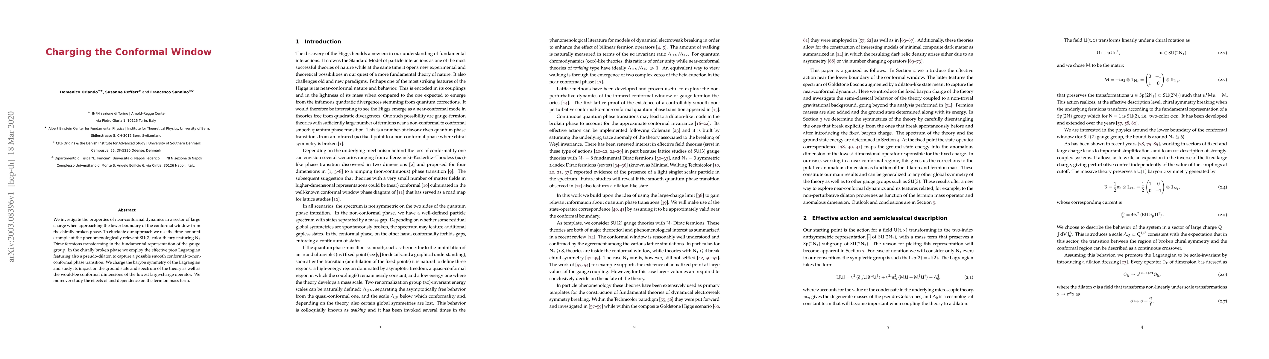 This paper explores the dynamics near the lower boundary of the conformal window in an SU(2) gauge theory with fermions, focusing on the effects of charging the baryon symmetry and examining the transition from a chirally broken to a potentially conformal phase. The study uses an effective pion Lagrangian and investigates the implications for the ground state, spectrum, and large-charge operator dimensions.