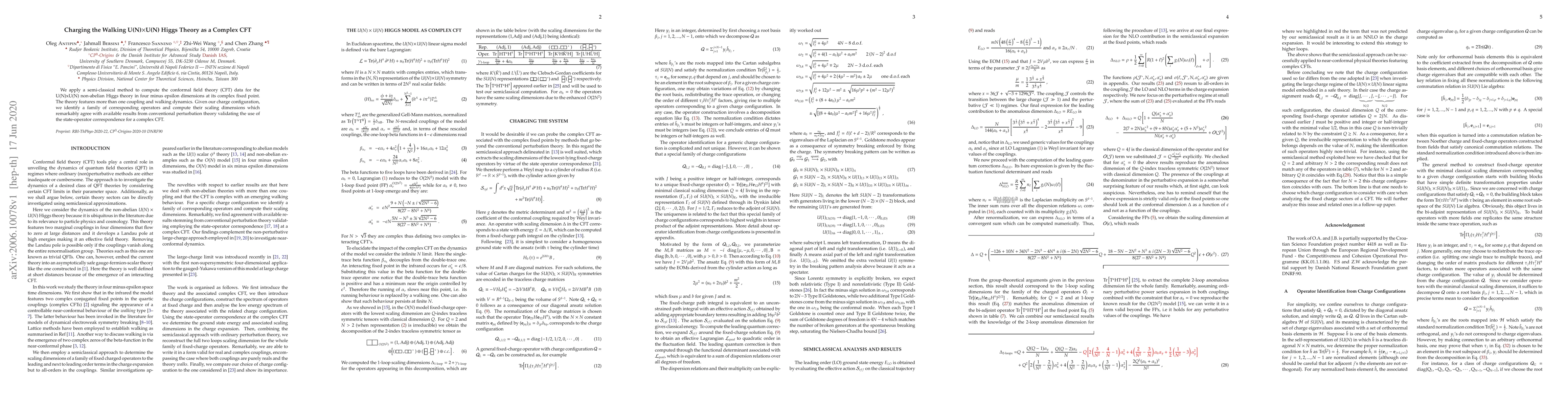 We apply a semi-classical method to compute the conformal field theory (CFT) data for the U(N)xU(N) non-abelian Higgs theory in four minus epsilon dimensions at its complex fixed point. The theory features more than one coupling and walking dynamics. Given our charge configuration, we identify a family of corresponding operators and compute their scaling dimensions which remarkably agree with available results from conventional perturbation theory validating the use of the state-operator correspondence for a complex CFT.