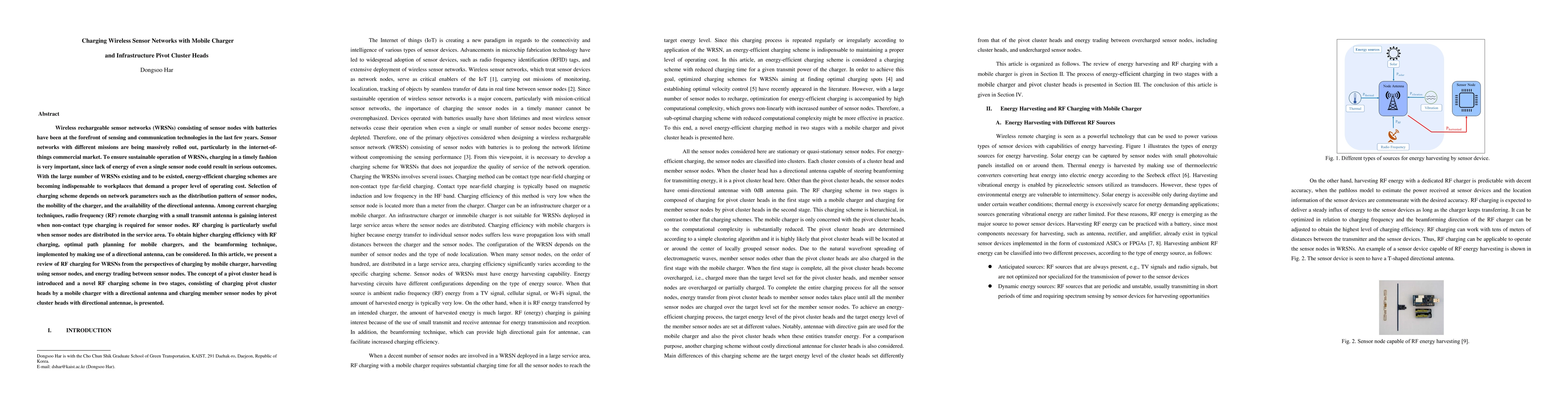 This paper reviews wireless rechargeable sensor networks (WRSNs) and proposes an efficient RF charging scheme. It introduces a novel two-stage RF charging method using a mobile charger and pivot cluster heads to optimize energy efficiency and reduce operational costs.