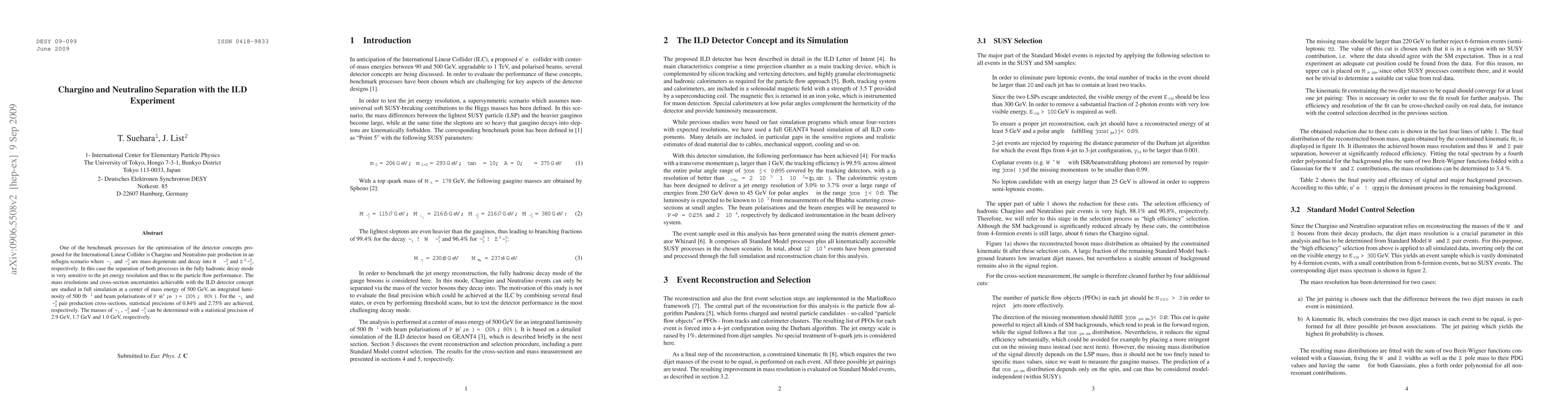 This paper investigates the separation of Chargino and Neutralino pair production in the ILD detector for the International Linear Collider at a center of mass energy of 500 GeV, achieving mass resolutions and cross-section uncertainties with statistical precisions of 0.84% and 2.75% respectively, and mass determinations of 2.9 GeV, 1.7 GeV, and 1.0 GeV for Chargino-1, Neutralino-2, and Neutralino-1.