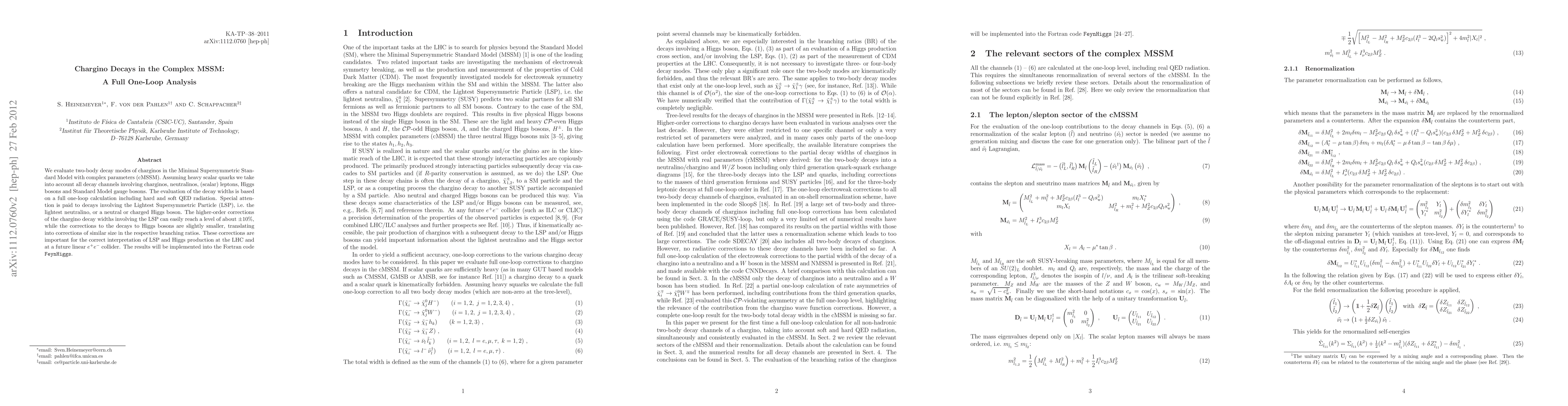 This paper presents a comprehensive one-loop analysis of chargino decay modes in the complex Minimal Supersymmetric Standard Model (cMSSM), focusing on two-body decays involving various particles. The study highlights significant higher-order corrections, especially in decays involving the Lightest Supersymmetric Particle (LSP) and Higgs bosons, which are crucial for interpreting experimental results at the LHC and future colliders.