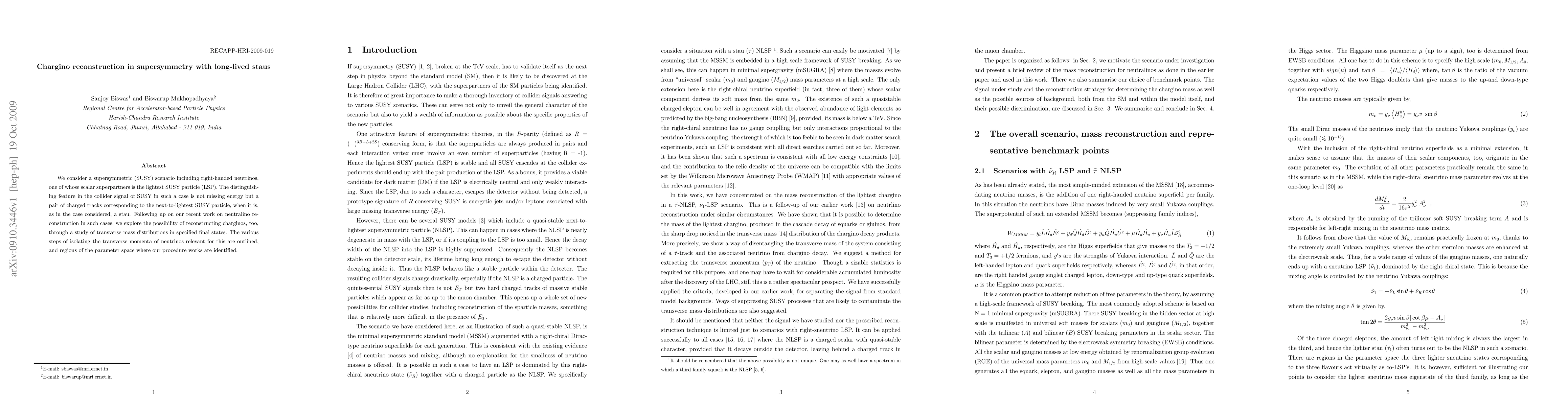 We consider a supersymmetric (SUSY) scenario including right-handed neutrinos, one of whose scalar superpartners is the lightest SUSY particle (LSP). The distinguishing feature in the collider signal of SUSY in such a case is not missing energy but a pair of charged tracks corresponding to the next-to- lightest SUSY particle, when it is, as in the case considered, a stau. Following up on our recent work on neutralino reconstruction in such cases, we explore the possibility of reconstructing charginos, too, through a study of transverse mass distributions in specified final states. The various steps of isolating the transverse momenta of neutrinos relevant for this are outlined, and regions of the parameter space where our procedure works are identified.