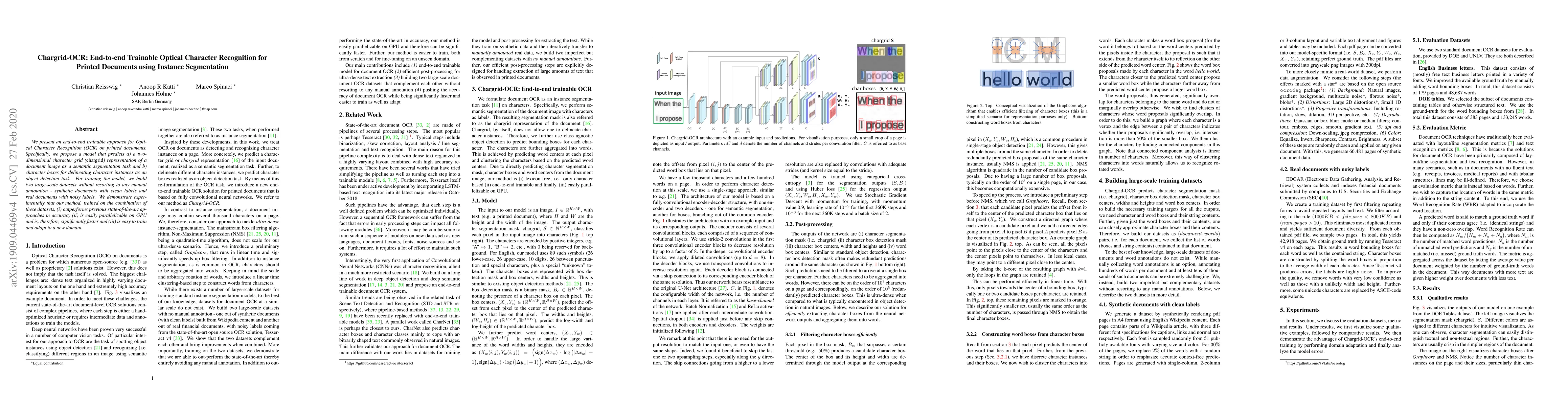 We present an end-to-end trainable approach for Optical Character Recognition (OCR) on printed documents. Specifically, we propose a model that predicts a) a two-dimensional character grid (\emph{chargrid}) representation of a document image as a semantic segmentation task and b) character boxes for delineating character instances as an object detection task. For training the model, we build two large-scale datasets without resorting to any manual annotation - synthetic documents with clean labels and real documents with noisy labels. We demonstrate experimentally that our method, trained on the combination of these datasets, (i) outperforms previous state-of-the-art approaches in accuracy (ii) is easily parallelizable on GPU and is, therefore, significantly faster and (iii) is easy to train and adapt to a new domain.